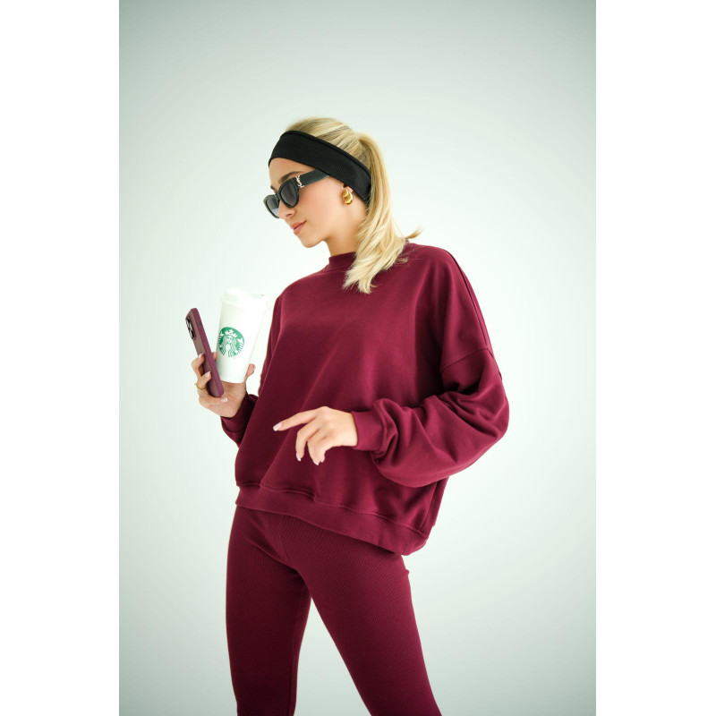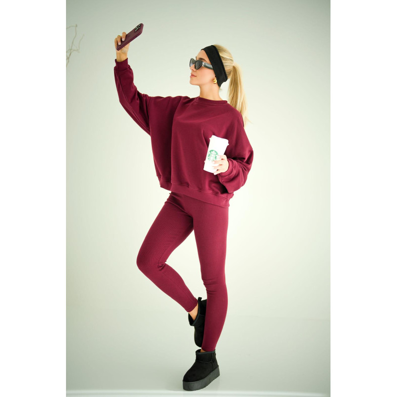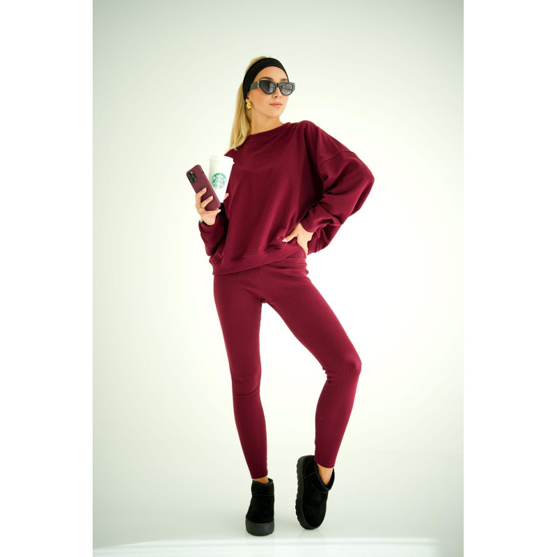 Bluza charakteryzuje się luźnym krojem, obniżoną linią ramion oraz okrągłym dekoltem. Dół i rękawy wykończone są subtelnym ściągaczem, co dodaje jej eleganckiego wykończenia. Legginsy, wykonane z prążkowanego materiału, doskonale modelują sylwetkę, a szeroka guma w pasie zapewnia idealne dopasowanie. Materiał jest elastyczny, a przy tym całkowicie nieprześwitujący, co czyni komplet nie tylko wygodnym, ale i praktycznym wyborem na każdą okazję.
