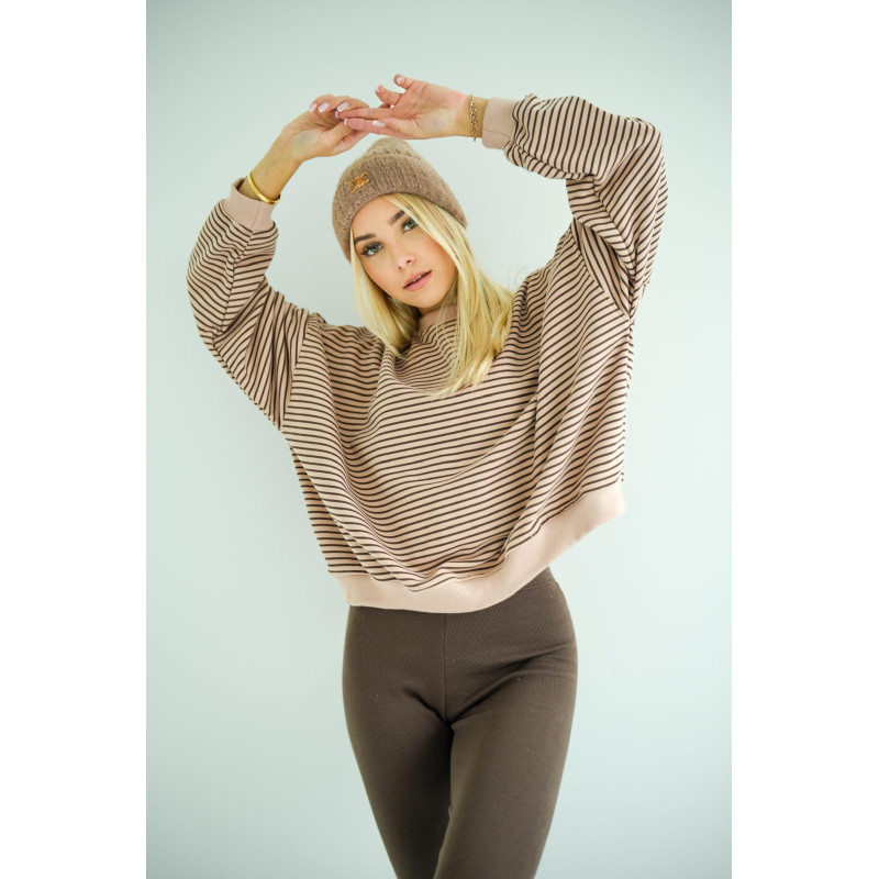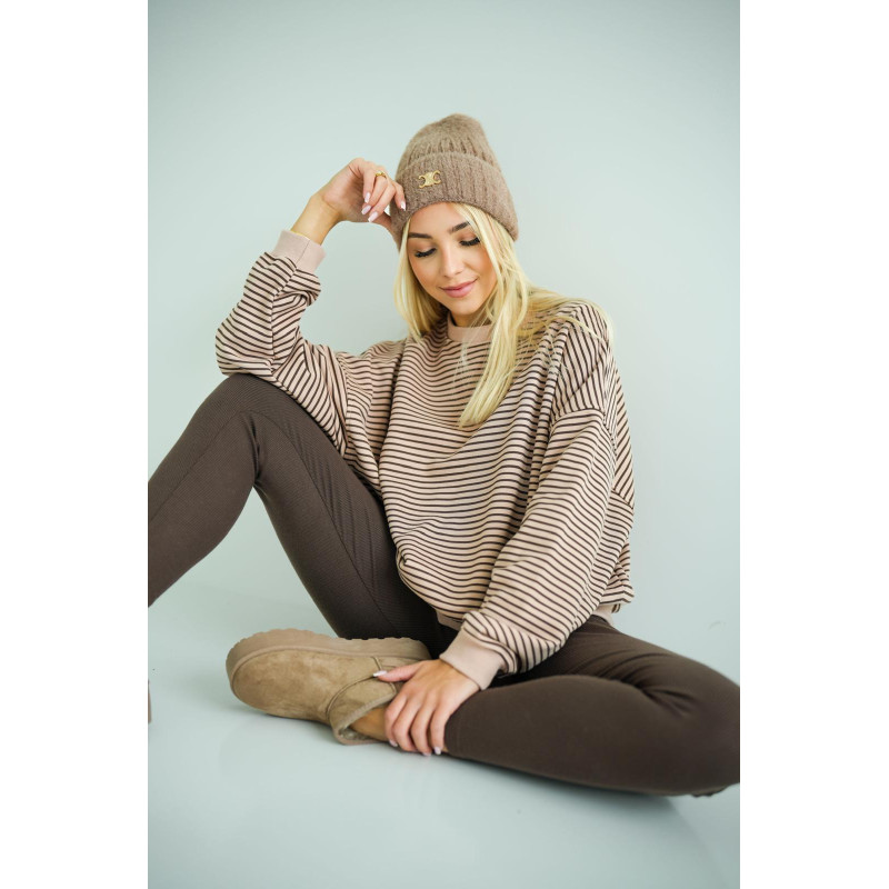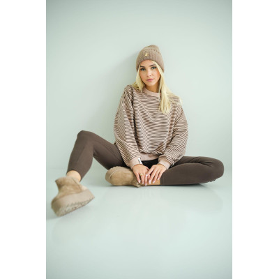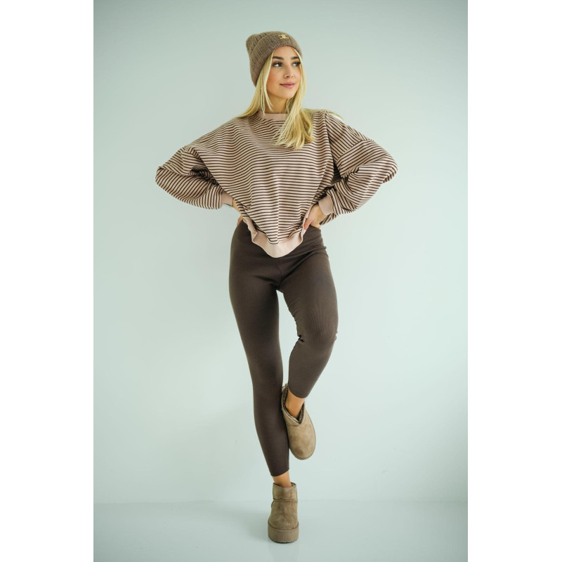 Bluza charakteryzuje się luźnym krojem, obniżoną linią ramion oraz okrągłym dekoltem. Dół i rękawy wykończone są subtelnym ściągaczem, co dodaje jej eleganckiego wykończenia. Legginsy, wykonane z prążkowanego materiału, doskonale modelują sylwetkę, a szeroka guma w pasie zapewnia idealne dopasowanie. Materiał jest elastyczny, a przy tym całkowicie nieprześwitujący, co czyni komplet nie tylko wygodnym, ale i praktycznym wyborem na każdą okazję.