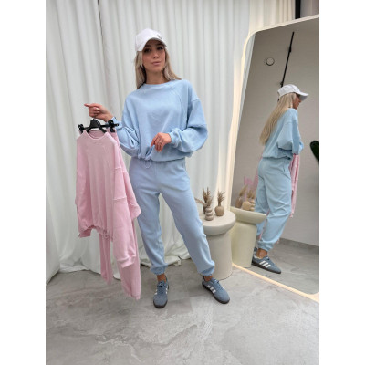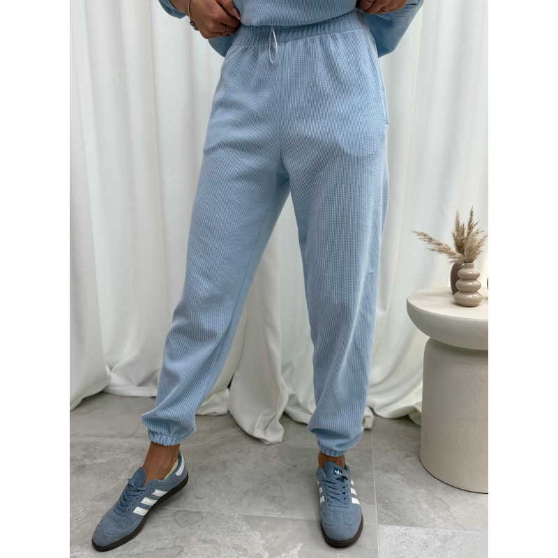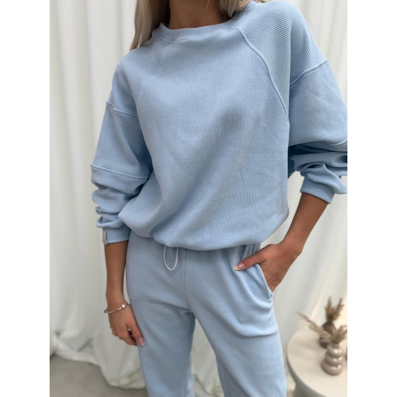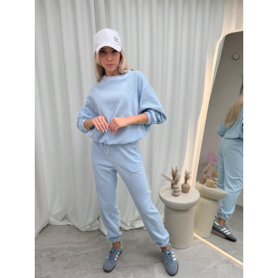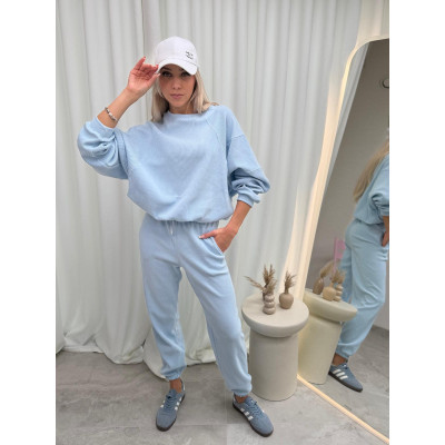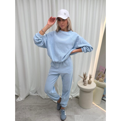 Komplet w casualowym stylu w przepi臋knym odcieniu b艂臋kitu. Wykonany jest z przyjemnego w dotyku materia艂u imituj膮cego sztruks.