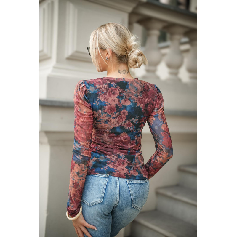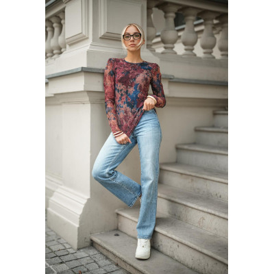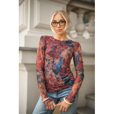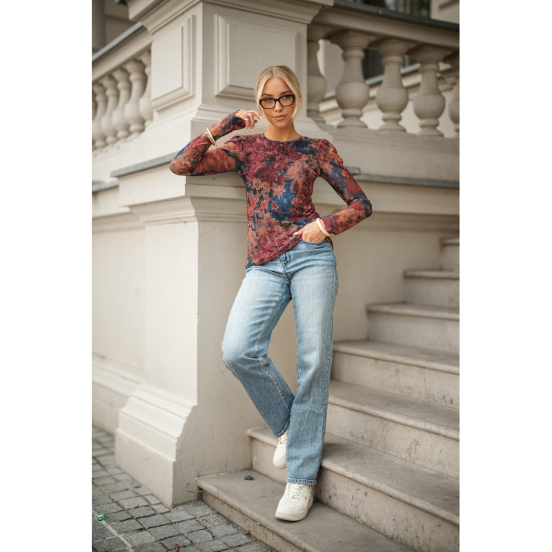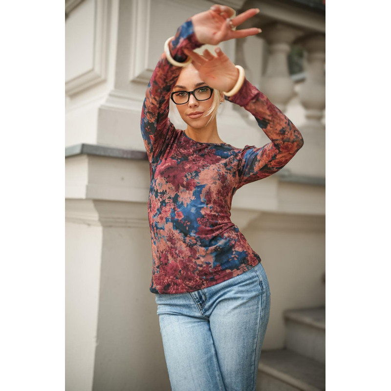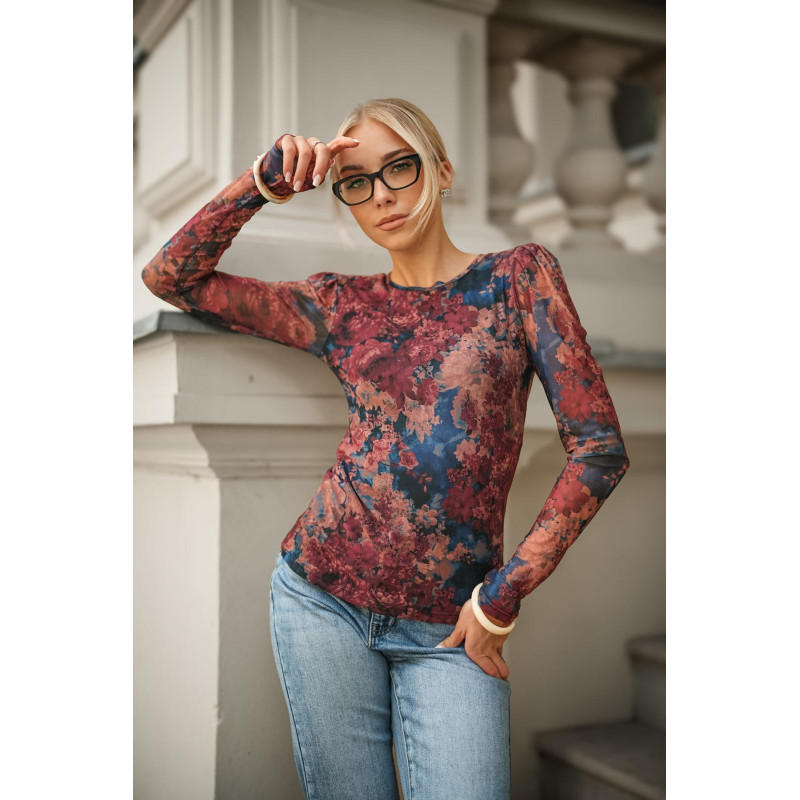 Dopasowana bluzka wykonana z siateczkowego materiału z dodatkiem wiskozy to propozycja pełna kobiecego uroku. Model ma długi, przylegający rękaw i klasyczny, zabudowany dekolt, dzięki czemu świetnie sprawdzi się w codziennych i eleganckich stylizacjach.