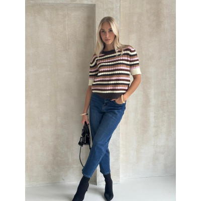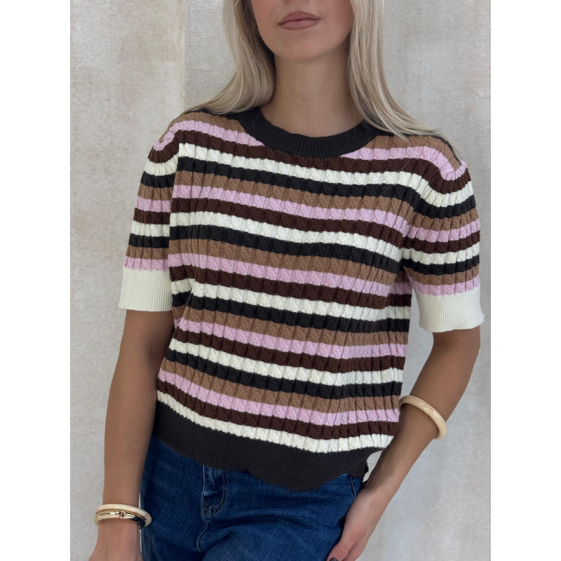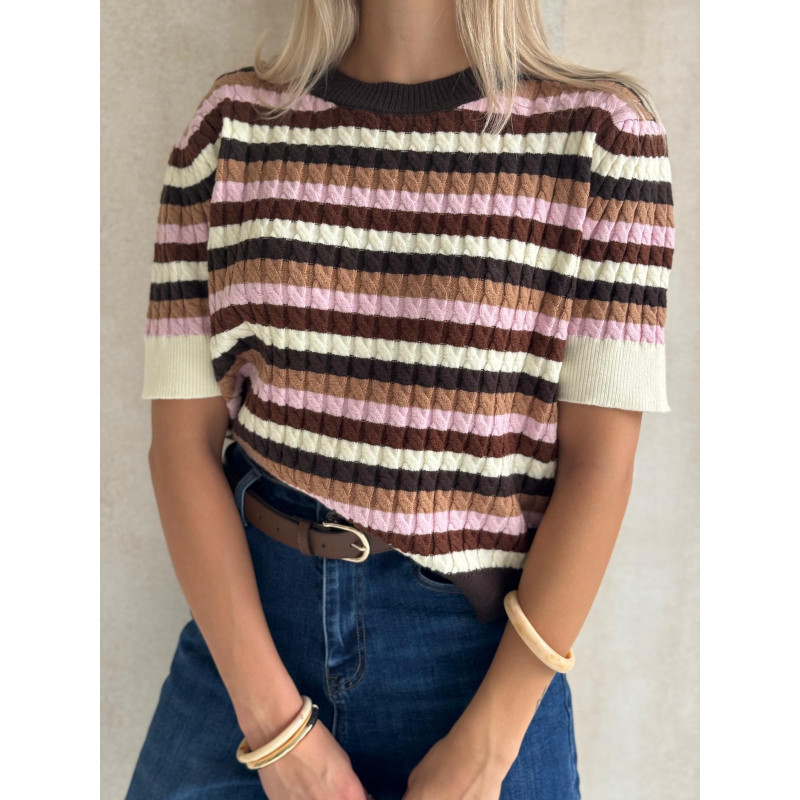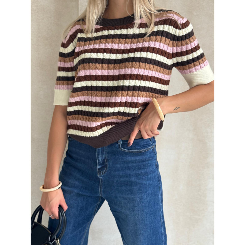 Sweterkowa bluzka z krótkim rękawem wykonana jest z miękkiej dzianiny o wyraźnej, prążkowanej fakturze, która pięknie się układa i zapewnia komfort noszenia przez cały dzień. Kolorowe pasy w jesienno–zimowej tonacji dodają charakteru i świetnie wpisują się w aktualne trendy.