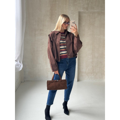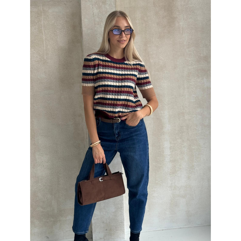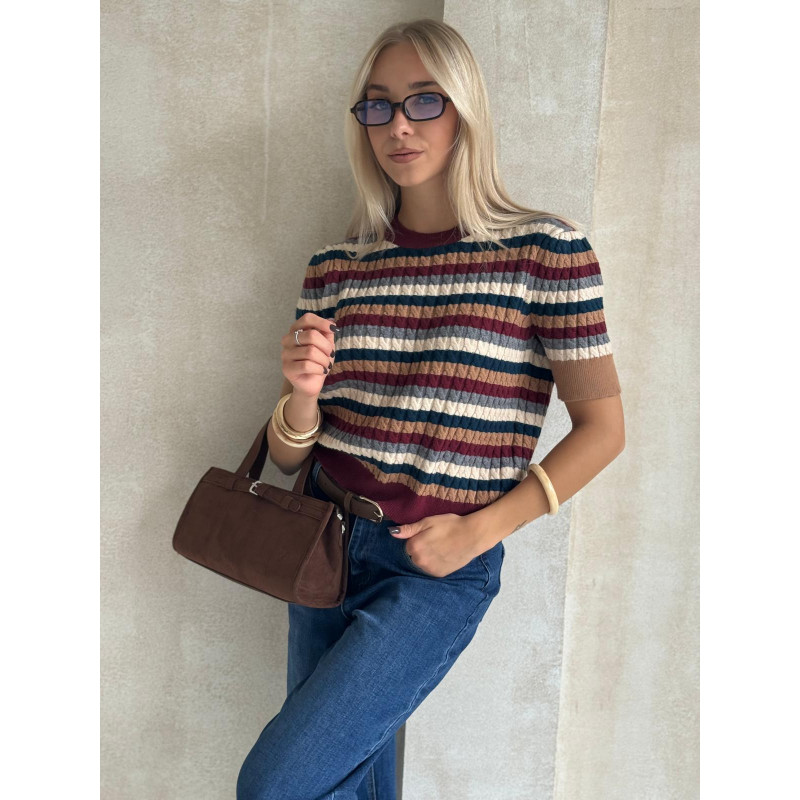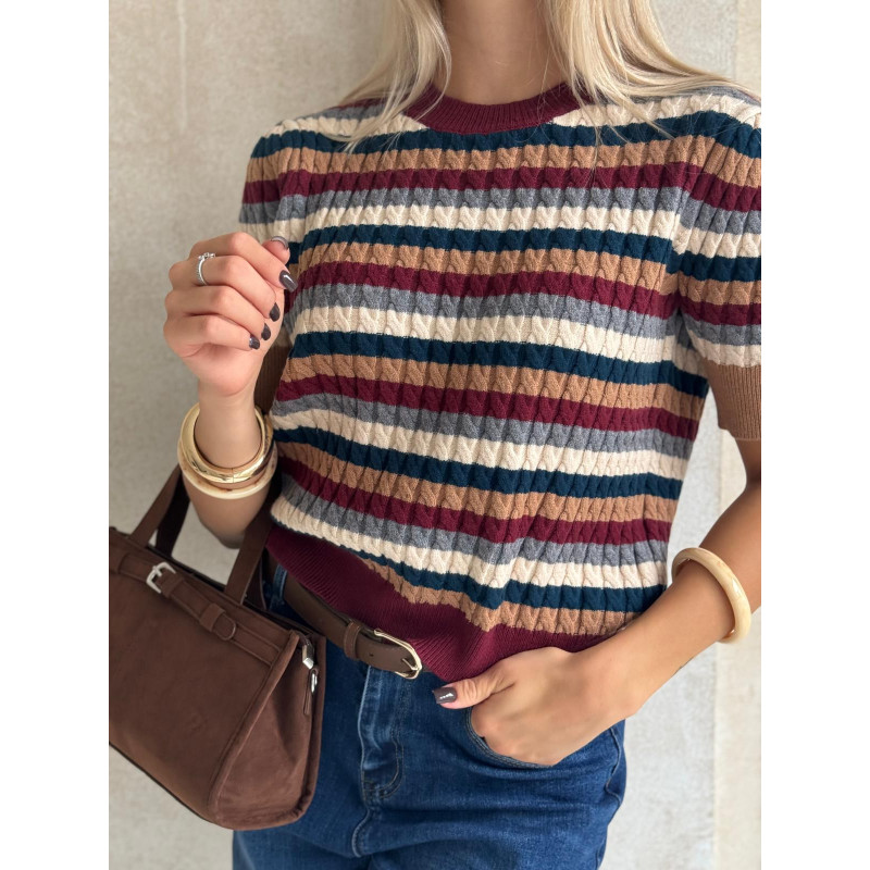 Sweterkowa bluzka z krótkim rękawem wykonana jest z miękkiej dzianiny o wyraźnej, prążkowanej fakturze, która pięknie się układa i zapewnia komfort noszenia przez cały dzień. Kolorowe pasy w jesienno–zimowej tonacji dodają charakteru i świetnie wpisują się w aktualne trendy.