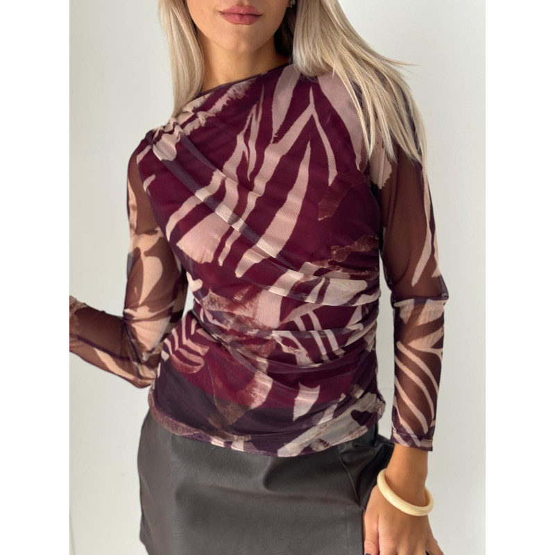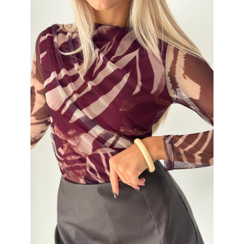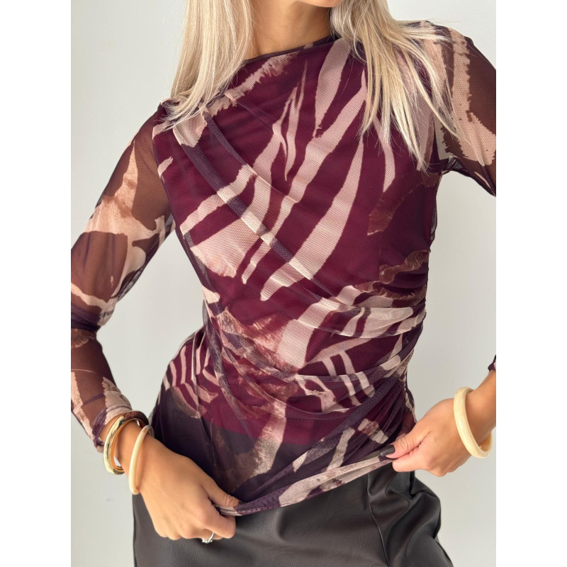 Długie rękawy i lekko drapowany przód nadają jej zmysłowości, a print w odcieniach bordo i beżu przyciąga wzrok i podkreśla jesienny klimat stylizacji.