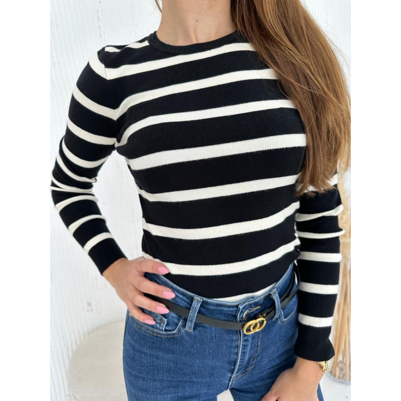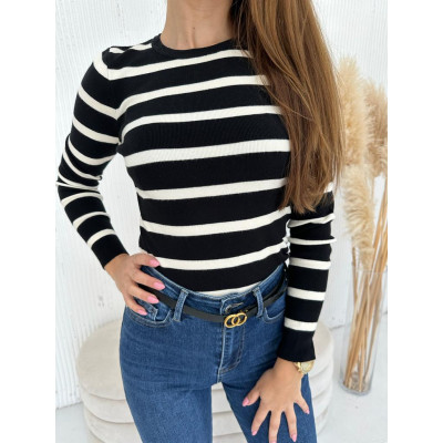Prążkowana bluzka w paski. Klasyczny dekolt, paski biegnące wzdłuż całej długości utrzymane w klasycznej kolorystyce. Wykonana z przyjemnego materiału z wiskozą w składzie. Bluzka jest uniwersalna pod kątem różnych stylizacji - od eleganckich spódnic po jeansy i trampki.