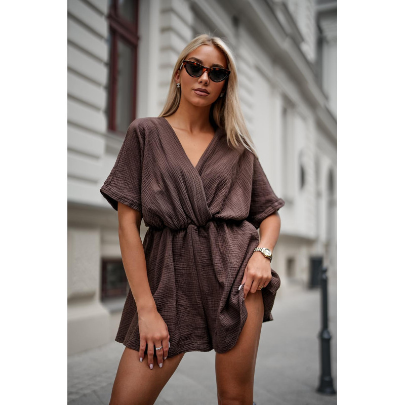 Ma kopertowy dekolt i krótkie, luźne rękawy w stylu kimono zapewniające wygodę i swobodę ruchów w każdej wakacyjnej sytuacji.