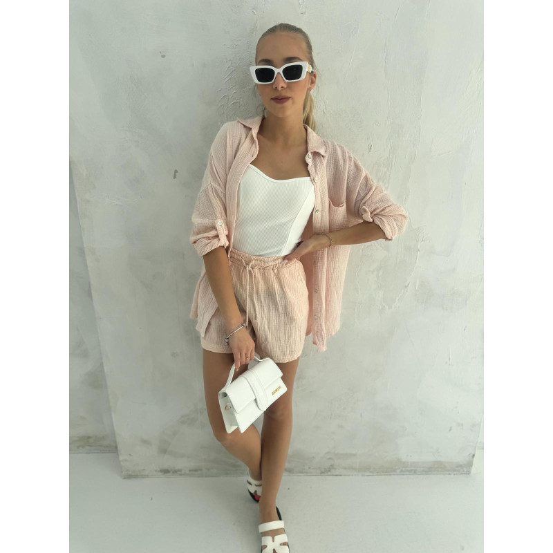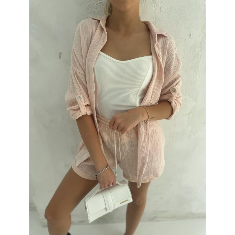 Wyjątkowo komfortowy komplet muślinowy składający z koszuli o kroju oversize i szortów na gumce.
