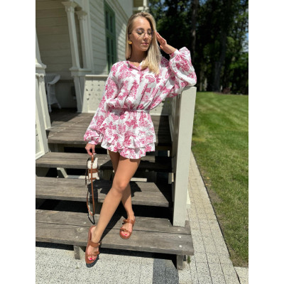 Spódnico-spodenki na gumce są zarówno wygodne jak i stylowe - dzięki elastycznej talii zapewniają doskonałe dopasowanie i łatwość zakładania. Ich luźny krój nie tylko podkreśla lekkość całej stylzacji, ale również skutecznie ukrywa wszelkie niedoskonałości, co czyni je idealnym wyborem dla każdej sylwetki. Całość zestawu pokryta jest delikatnym, kwiatowym printem.