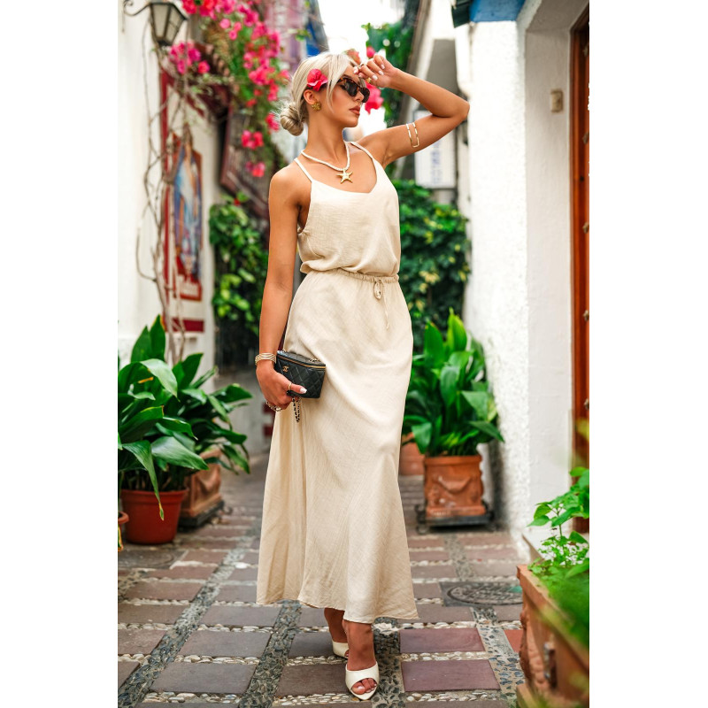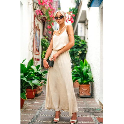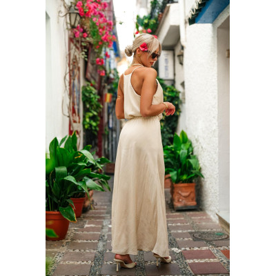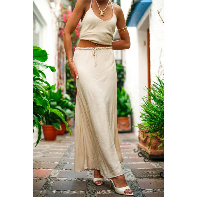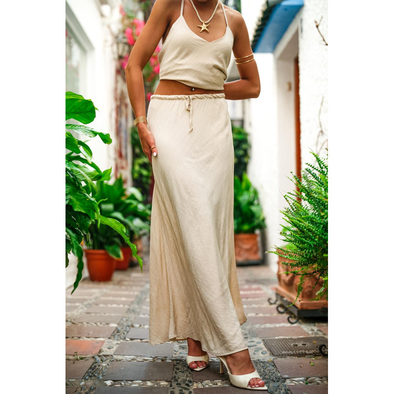 Komplet SANTORINI składający się ze spódnicy maxi z wysokim stanem – uszyta z przyjemnej w dotyku wiskozy, wyposażonej w elastyczną gumkę i sznurek w pasie, co zapewnia komfort i perfekcyjne dopasowanie do sylwetki oraz luźnego topu na cienkich ramiączkach z dekoltem w kształcie litery V – subtelny, ale efektowny i świetnie układający się na ciele -dodaje letniej stylizacji lekkości.