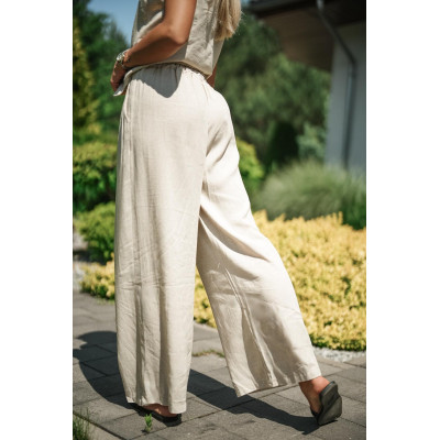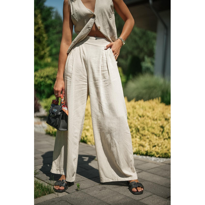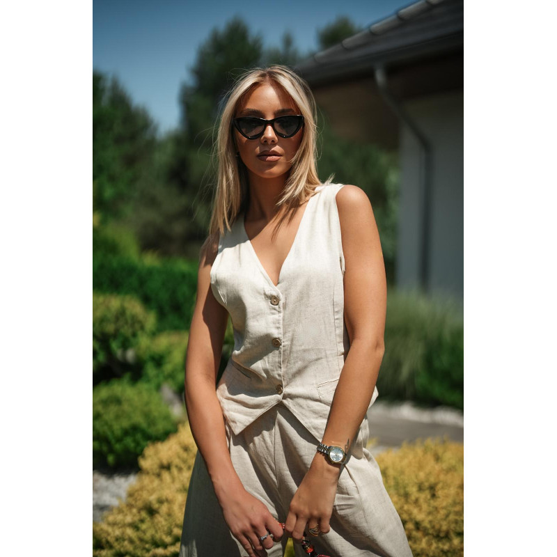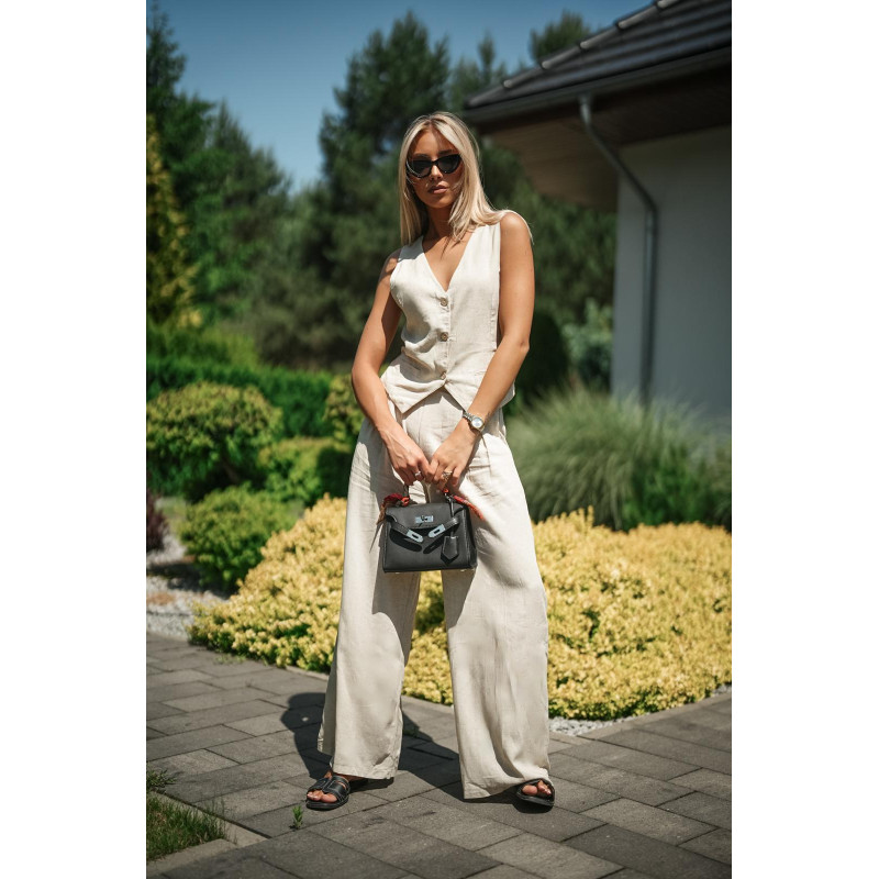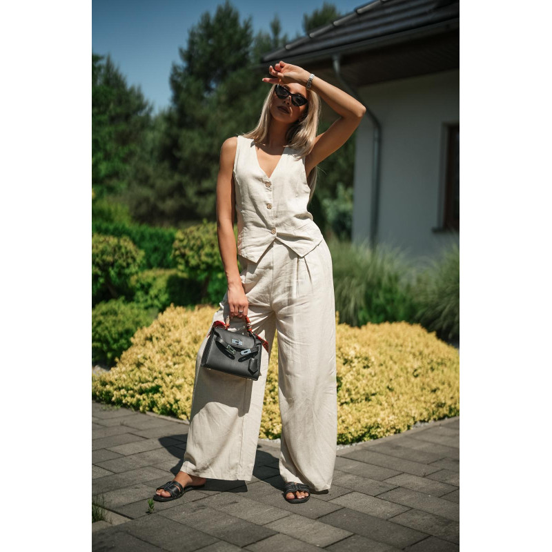 Stylowy, letni komplet składający się z kamizelki zapinanej na guziki oraz szerokich spodni z nieco wysokim stanem. Uszyty z przewiewnej mieszanki lnu i wiskozy – jest lekki, oddychający i bardzo wygodny.