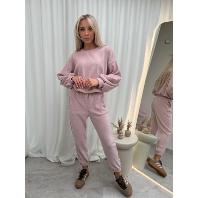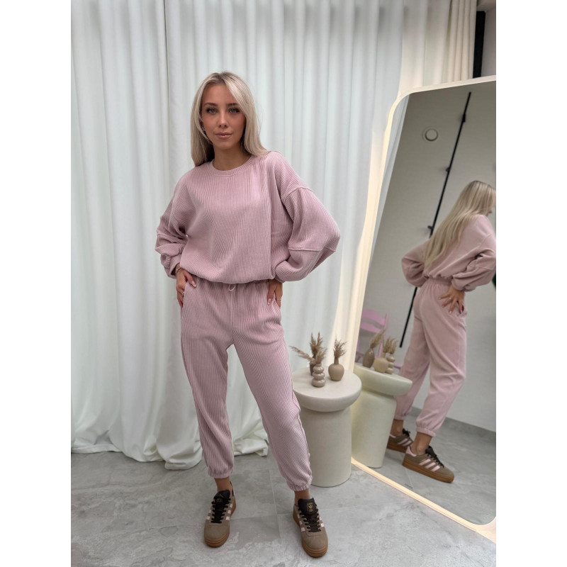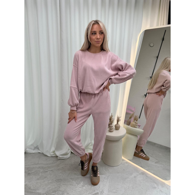 Komplet składa się z luźnej bluzy o swobodnym kroju z długimi rękawami oraz spodni typu jogger z elastyczną talią i regulacją w pasie. Bluza pięknie układa się na sylwetce, a spodnie posiadają praktyczne kieszenie oraz ściągacze przy nogawkach, które nadają całości sportowego, nowoczesnego looku.
