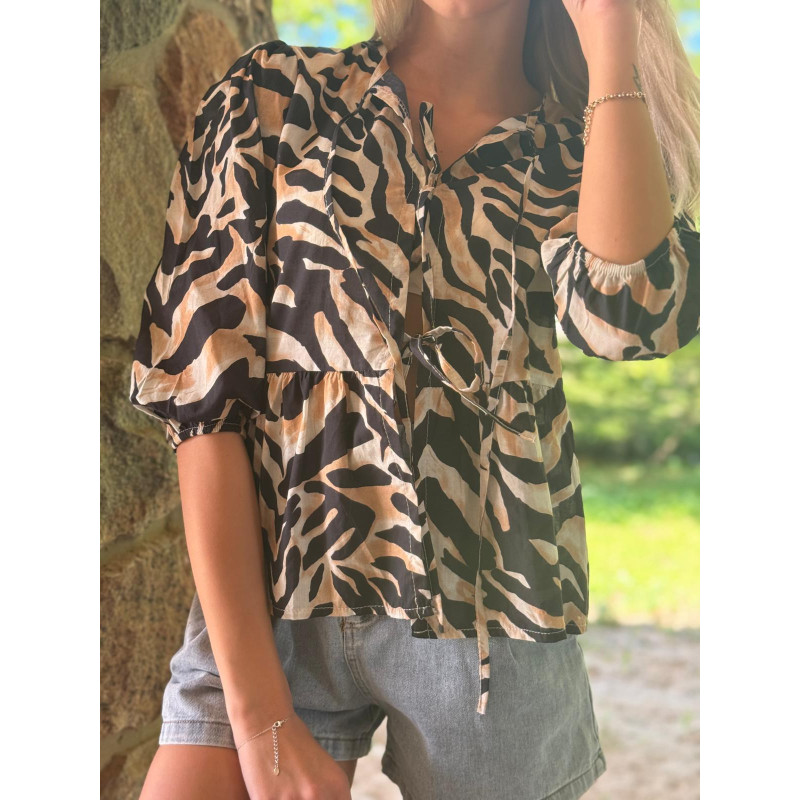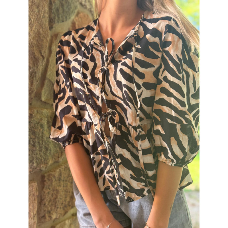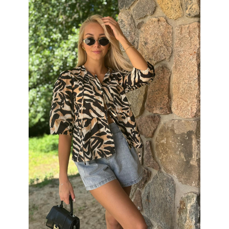 Bluzka z subtelnym dekoltem i bufiastymi  rękawy o długości 3/4. Wiązanie z przodu dodaje jej oryginalności i pozwala na delikatne dopasowanie do sylwetki.