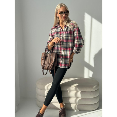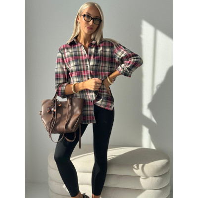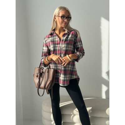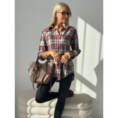 Model zapinany na guziki, z klasycznym kołnierzykiem i modnym wzorem w szaro–różową kratę.