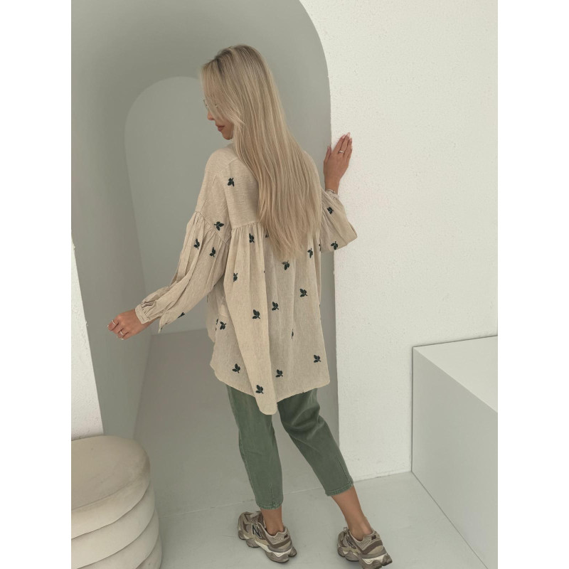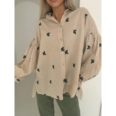 Oversize’owy krój z obniżoną linią ramion i lekko bufiastymi rękawami zakończonymi gumką sprawia, że koszula pięknie się układa, a przy tym daje pełną swobodę ruchów i komfort noszenia. Ma asymetryczny, przedłużony krój, dzięki czemu możesz nosić ją zarówno klasycznie do spodni czy szortów, jak i w formie narzutki.