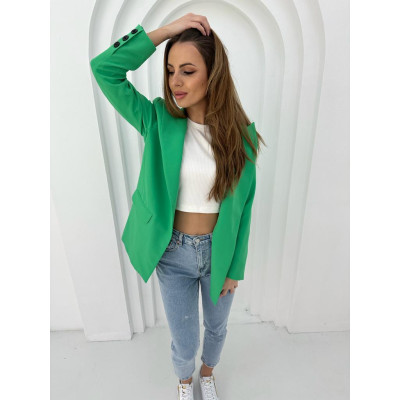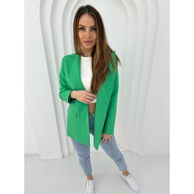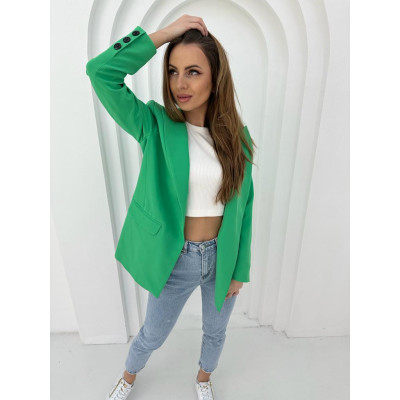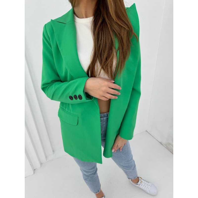 Model z przed艂u偶anym krojem, z imitacjami kieszeni po bokach. Marynarka bez zapi臋cia, ozdobiona czarnymi guzikami na r臋kawach.