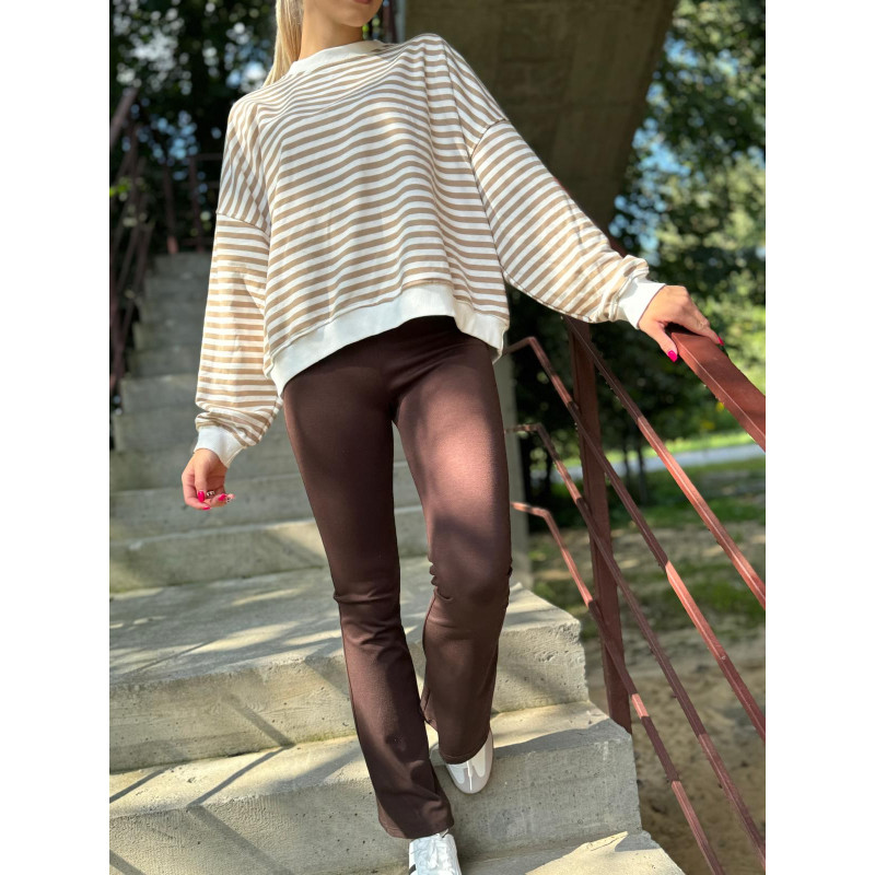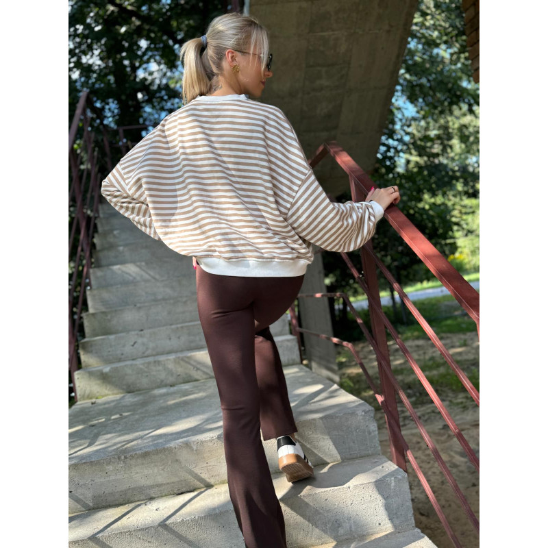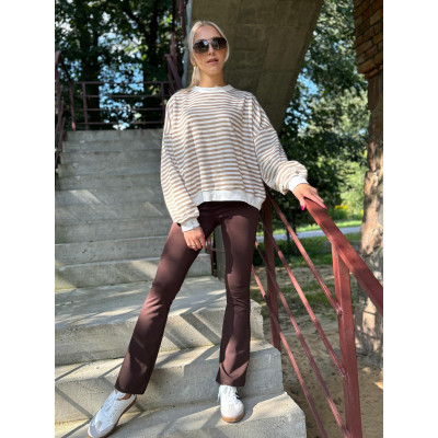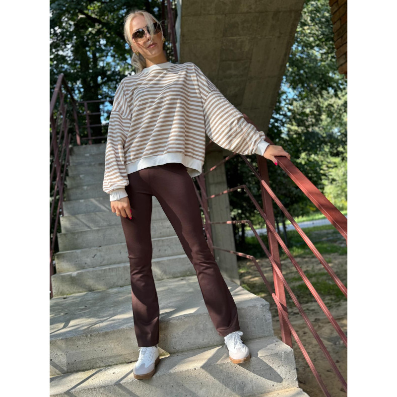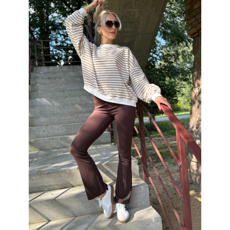 Połącz spodnie dzwony z luźną bluzą w modne paski i załóż sportowe obuwie.