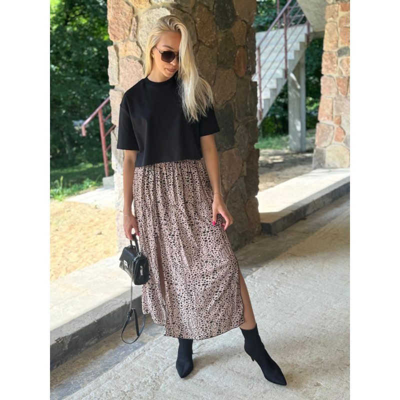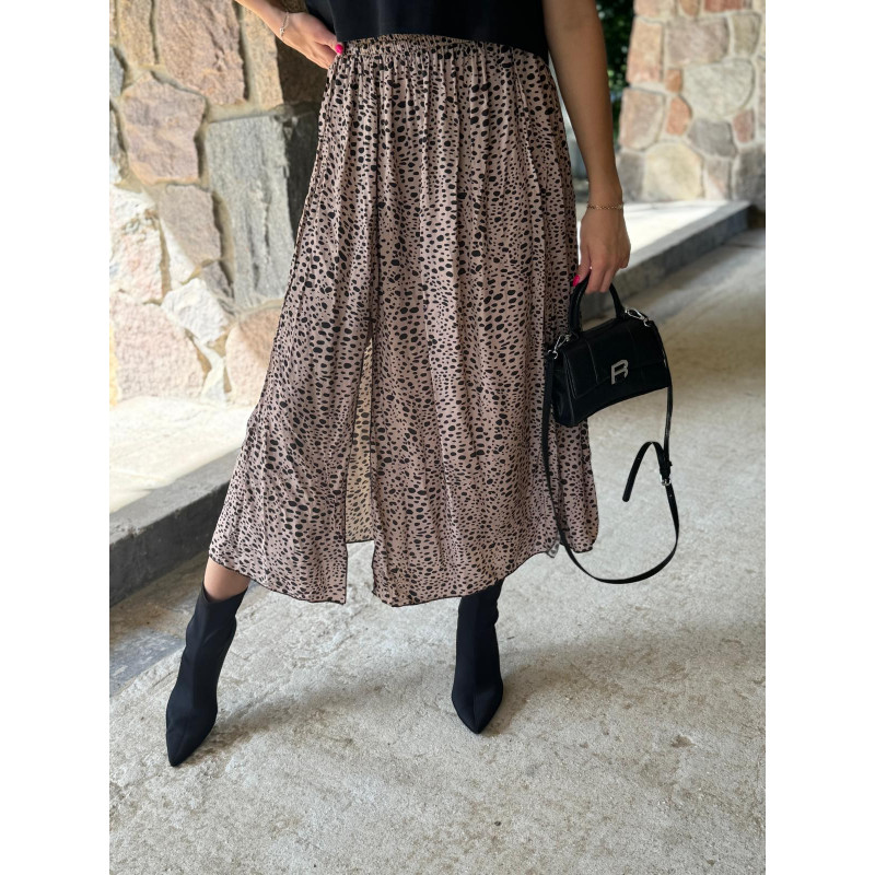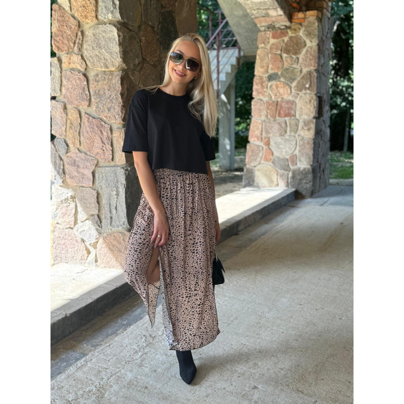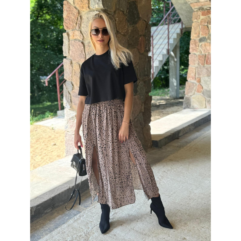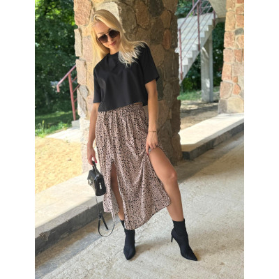 Spódnica midi z dwoma bocznymi rozcięciami to must-have na nadchodzący sezon jesienny. Wyrazisty print w czarne cętki na beżowym podbiciu doskonale wpisują się w najnowsze trendy, dodając każdej stylizacji charakteru i elegancji. Wykonana z wysokiej jakości wiskozy, spódnica jest nie tylko przyjemna w dotyku, ale także przewiewna i lekka, co zapewnia komfort noszenia przez cały dzień.
