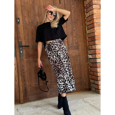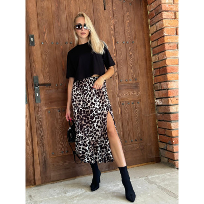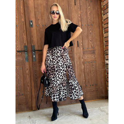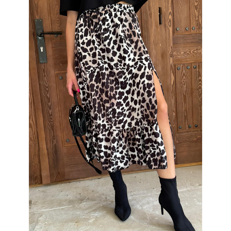 Spódnica midi z dwoma bocznymi rozcięciami to idealny wybór na jesienne dni. Wykończona delikatną falbanką na dole, dodaje subtelnego uroku każdej stylizacji. Jej wyróżnikiem jest modny jesienny print w panterkę camel na ciemnym tle, który przyciąga wzrok i dodaje charakteru.
