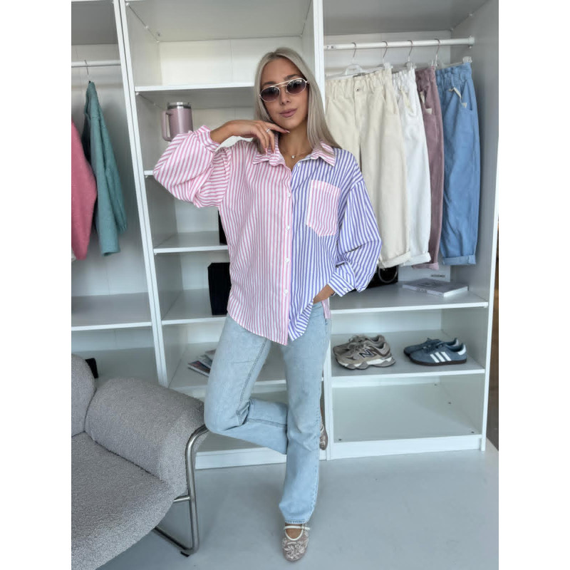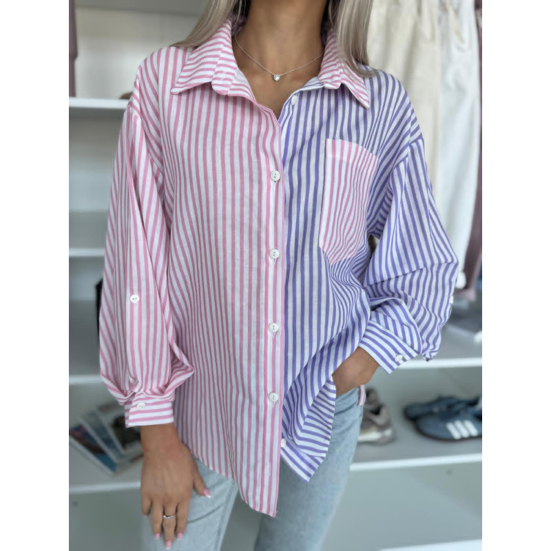 Koszula, która od razu przyciąga spojrzenia swoim kolorowym, patchworkowym designem Model łączy pastelowe pasy w odcieniach różu i delikatnego fioletu, tworząc modny, świeży efekt idealny na wiosnę i lato.