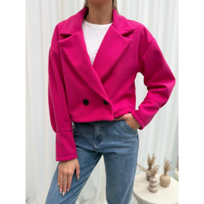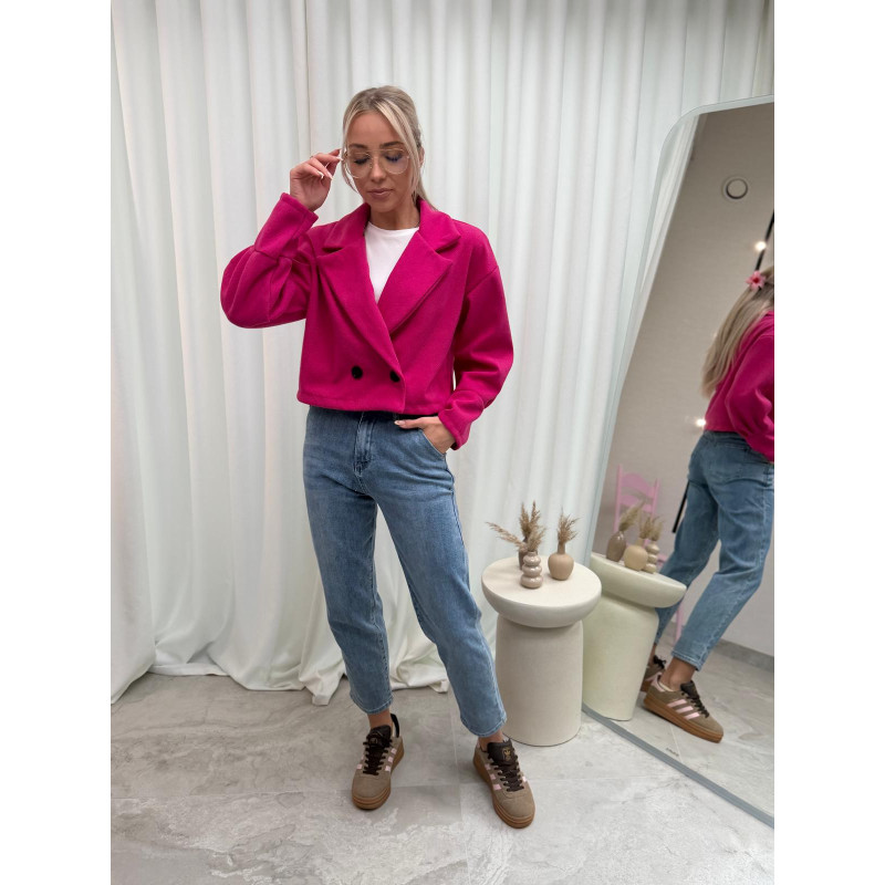 Krótki, nowoczesny kroju to idealne połączenie prostoty i elegancji. Zapinana na dwa czarne guziki, wyróżnia się marynarkowym fasonem oraz szerokim kołnierzem, co umożliwia stylizowanie jej na różne sposoby – od casualowych po bardziej formalne. Długie rękawy z ozdobnymi marszczeniami na mankietach dodają jej wyjątkowego charakteru.