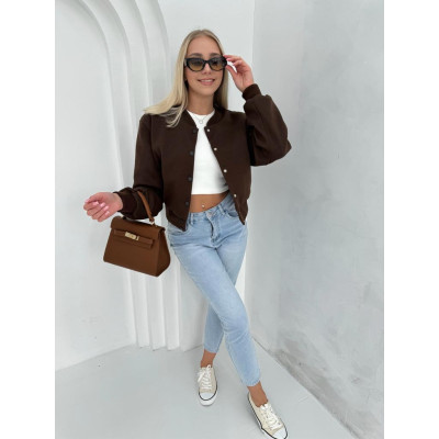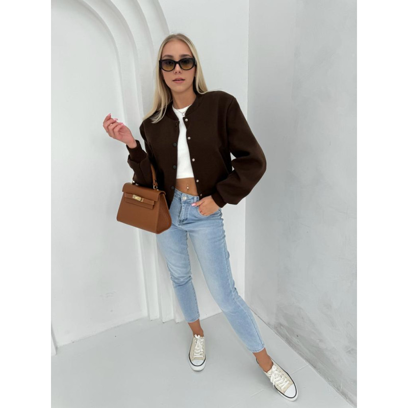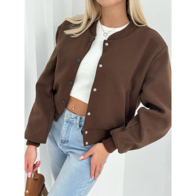 Bomberka Livia to lekka, przejściowa kurtka o krótkim kroju. W całości zapinana jest na zatrzaski, ze strukturalnym wzorem "jodełki". Kołnierz ze stójką, dół oraz rękawy kurtki wykończone delikatnie prążkowanym ściagaczem. Kurtka na podszewce, z wszytymi na stałe poduszkami na ramionach oraz bocznymi kieszonkami.