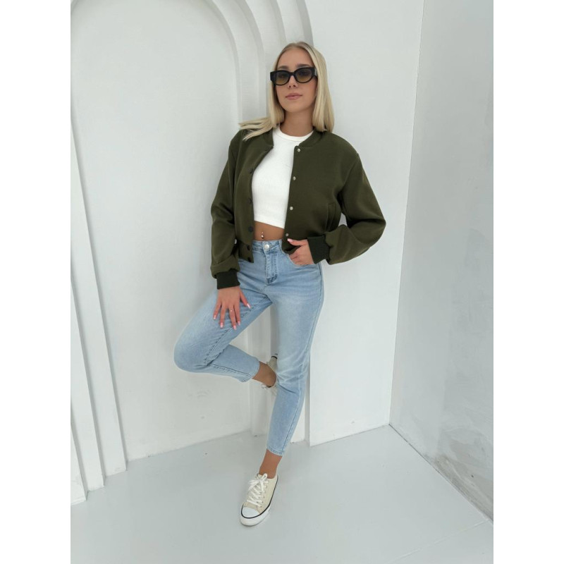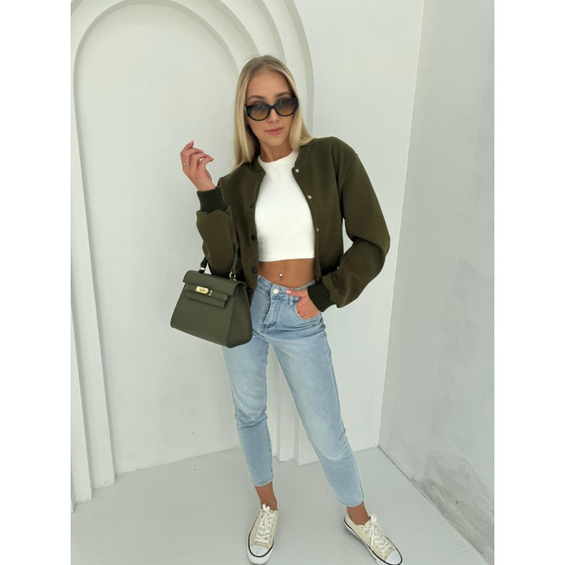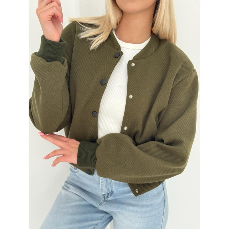 Bomberka Livia to lekka, przejściowa kurtka o krótkim kroju. W całości zapinana jest na zatrzaski, ze strukturalnym wzorem "jodełki". Kołnierz ze stójką, dół oraz rękawy kurtki wykończone delikatnie prążkowanym ściagaczem. Kurtka na podszewce, z wszytymi na stałe poduszkami na ramionach oraz bocznymi kieszonkami.