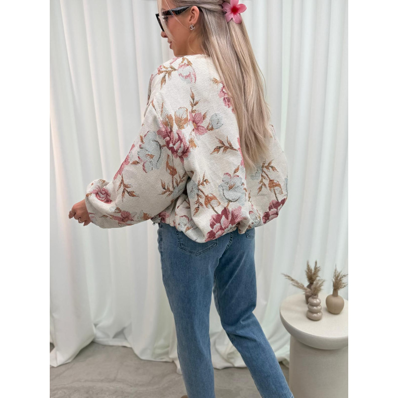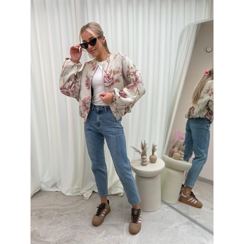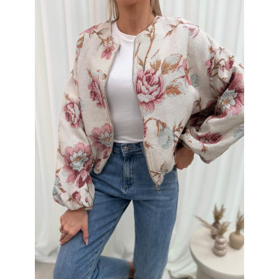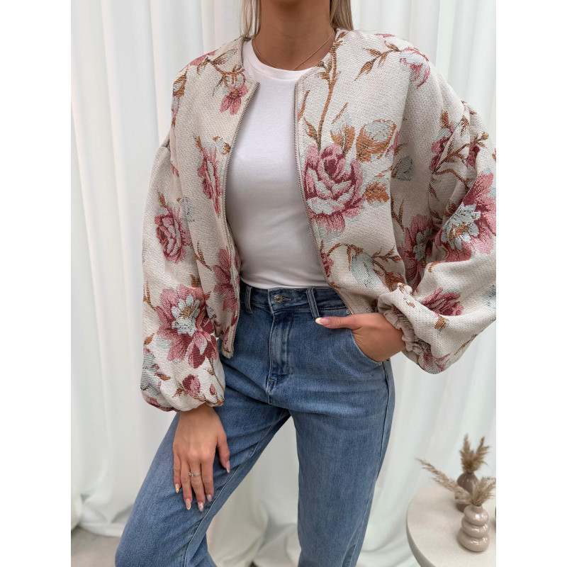 Krótka bamberka zapinana na suwak z kwiatowym wzorem. Rękawy bufiaste, zakończone gumką.