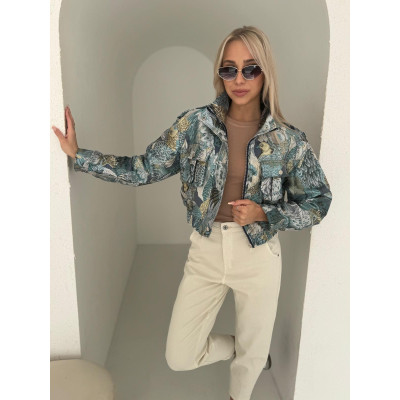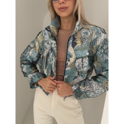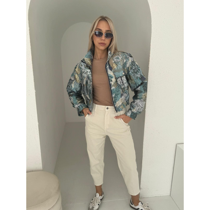 Krótka kurtka z wyrazistym, kolorowym wzorem. Zapinana na zamek + napy przy kołnierzu. Wyższy kołnierz można nosić zapięty lub rozpięty.