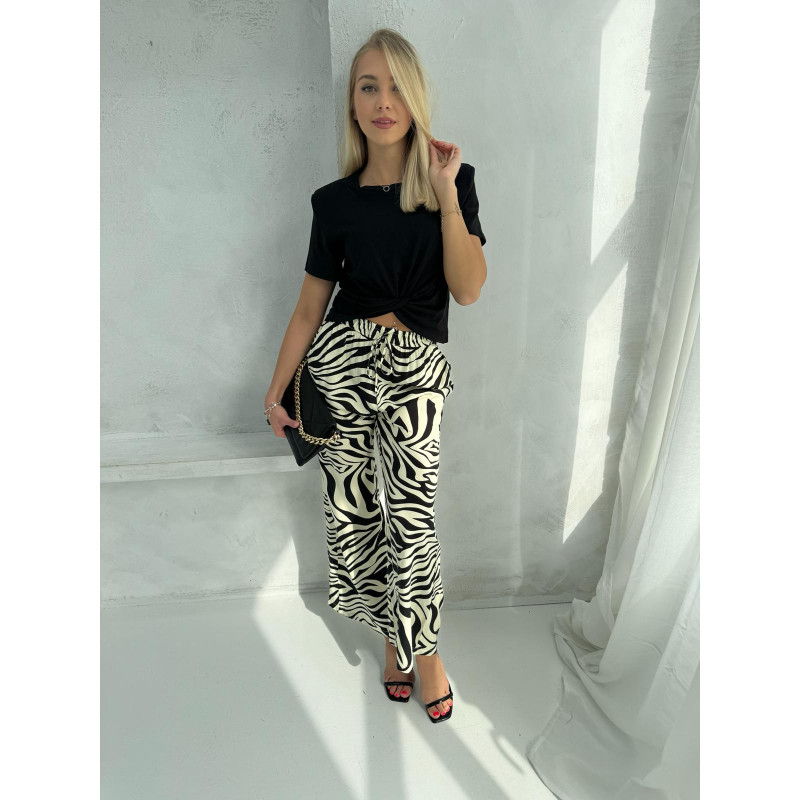 Spodnie typu CULOTTE w modny wzór zebry na beżowym podbiciu. Model z wiązaniem w pasie i elastyczną gumką pasie zapewniająca idealne dopasowanie i komfort noszenia przez cały dzień. Proste i szerokie nogawki sprawiają, że spodnie są niezwykle wygodne i przewiewne. Wsuwane kieszonki po bokach są nie tylko praktyczne, ale także dodają uroku temu modelowi.