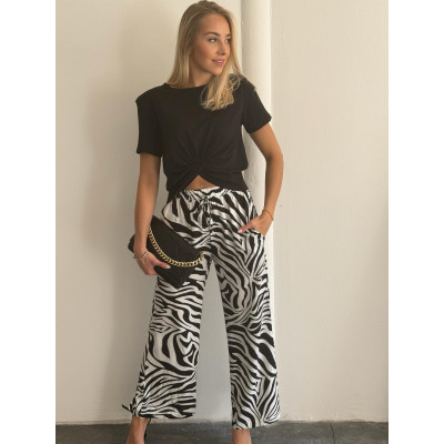 Spodnie typu CULOTTE w modny wzór zebry. Model z wiązaniem w pasie i elastyczną gumką pasie zapewniająca idealne dopasowanie i komfort noszenia przez cały dzień. Proste i szerokie nogawki sprawiają, że spodnie są niezwykle wygodne i przewiewne. Wsuwane kieszonki po bokach są nie tylko praktyczne, ale także dodają uroku temu modelowi.