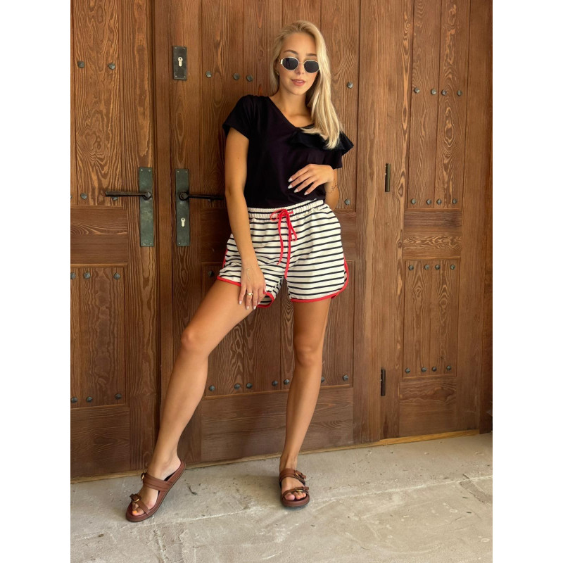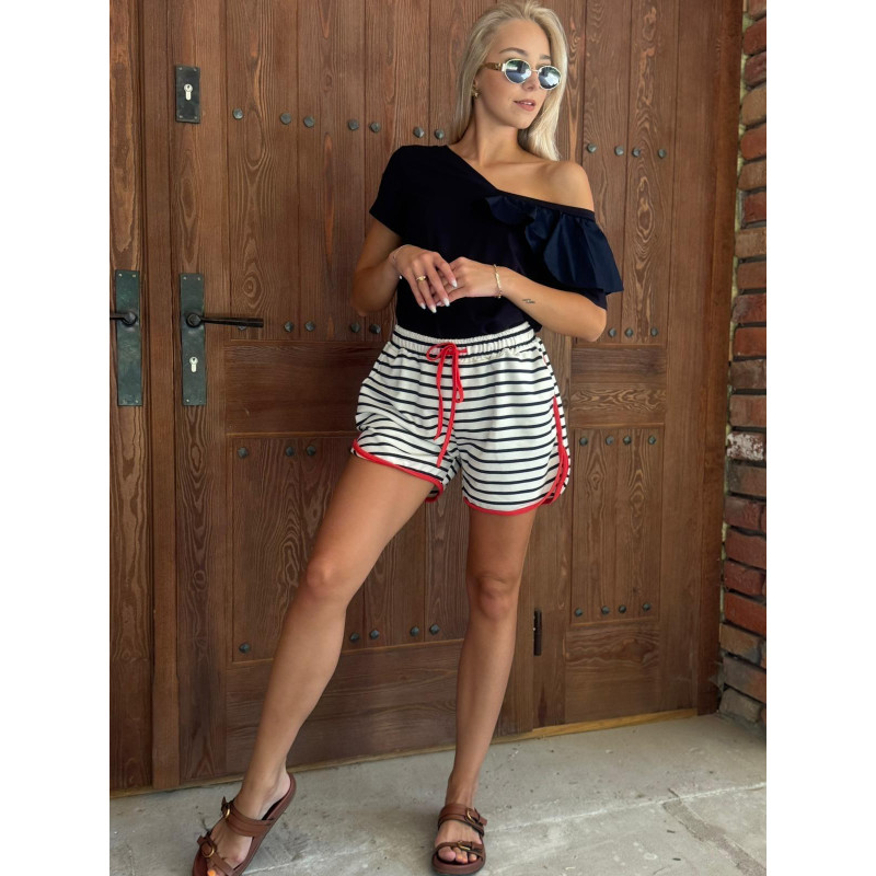 Szorty pokryte są ponadczasowym wzorem w paski, a szeroka gumka w talii oraz praktyczne troczki umożliwiają regulację szerokości, zapewniając wygodę noszenia. Wykończone kontrastująca lamówką, te szorty są idealne na co dzień.