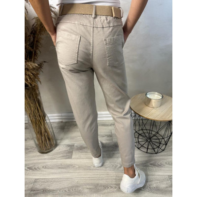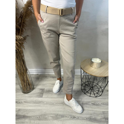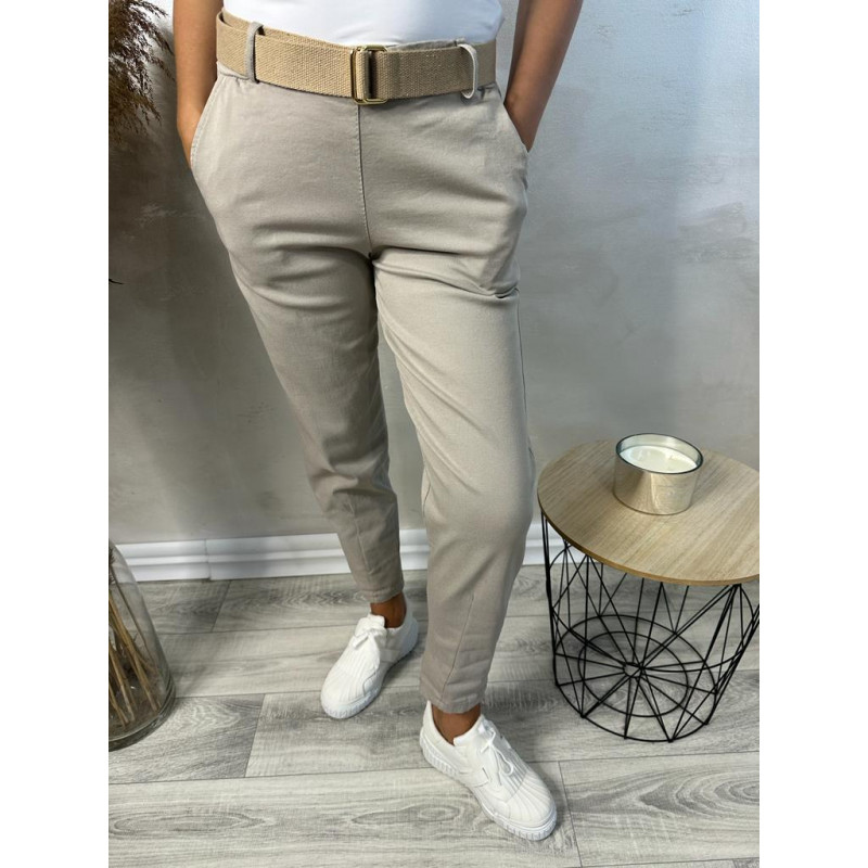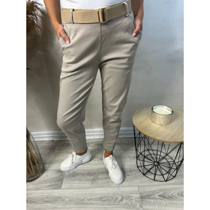 Spodnie Gina - wygodne chinosy wykonane z wysokiej jakości materiału bawełnianego z domieszką wiskozy w składzie. Delikatnie zwężane nogawki, dwie wpuszczane kieszenie z przodu oraz dwie naszyte kieszonki z tyłu tego modelu. W zestawie beżowy, parciany pasek.
