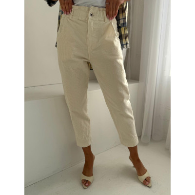 Lekko wysoki stan z delikatnym marszczeniem w pasie subtelnie podkreśla talię, a luźniejsza nogawka zapewnia komfort noszenia przez cały dzień.