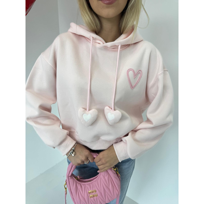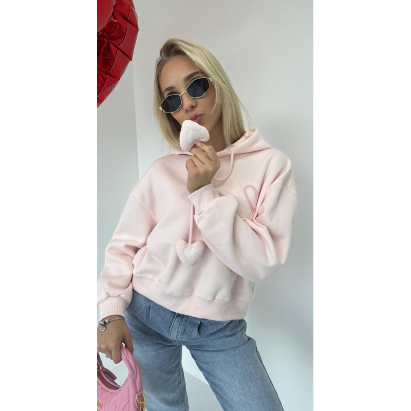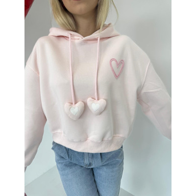 Na przodzie znajduje się subtelna aplikacja w kształcie serca, która nadaje bluzie romantycznego charakteru. Kaptur wyposażony jest w troczki zakończone pluszowymi serduszkami, co stanowi wyjątkowy i bardzo dziewczęcy detal.