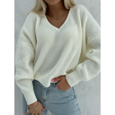 Sweter Kama o luźnym kroju z obniżoną linią ramion. Dekolt w kształcie litery V, dół oraz rękawy swetra wykończone ściągaczem. Bardzo uniwersalny dodatek do wielu stylizacji - noś go z ulubionymi jeansami lub spódnicą w mocnym princie.