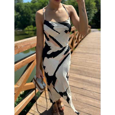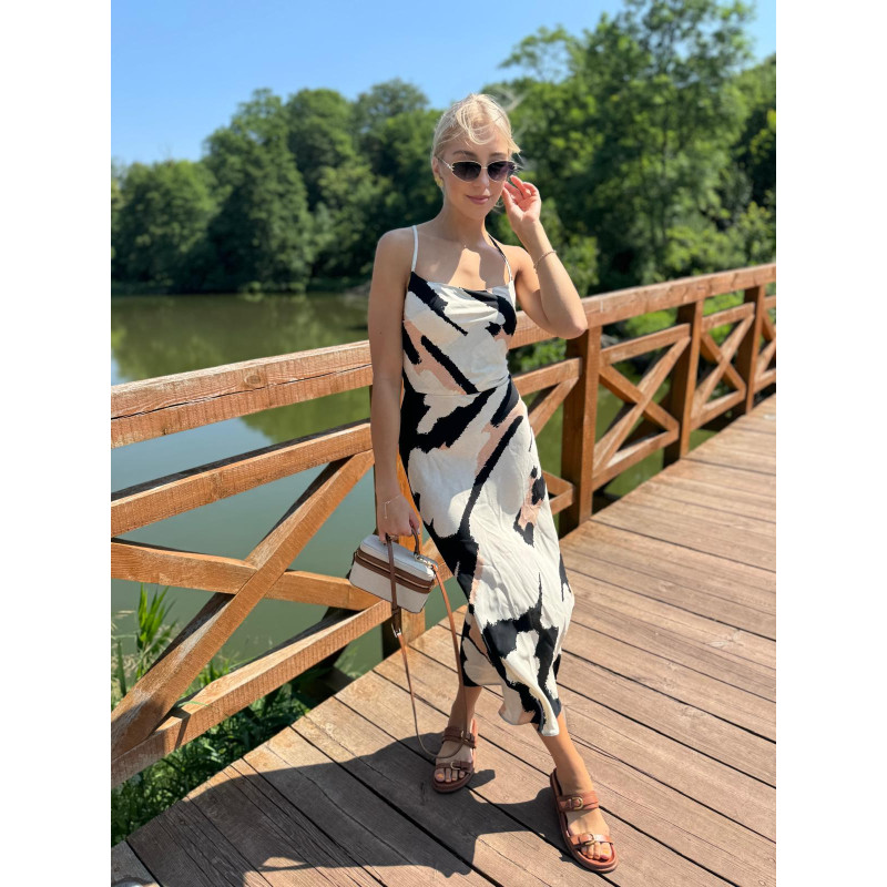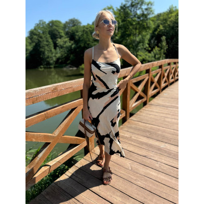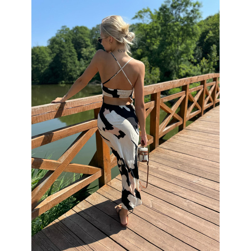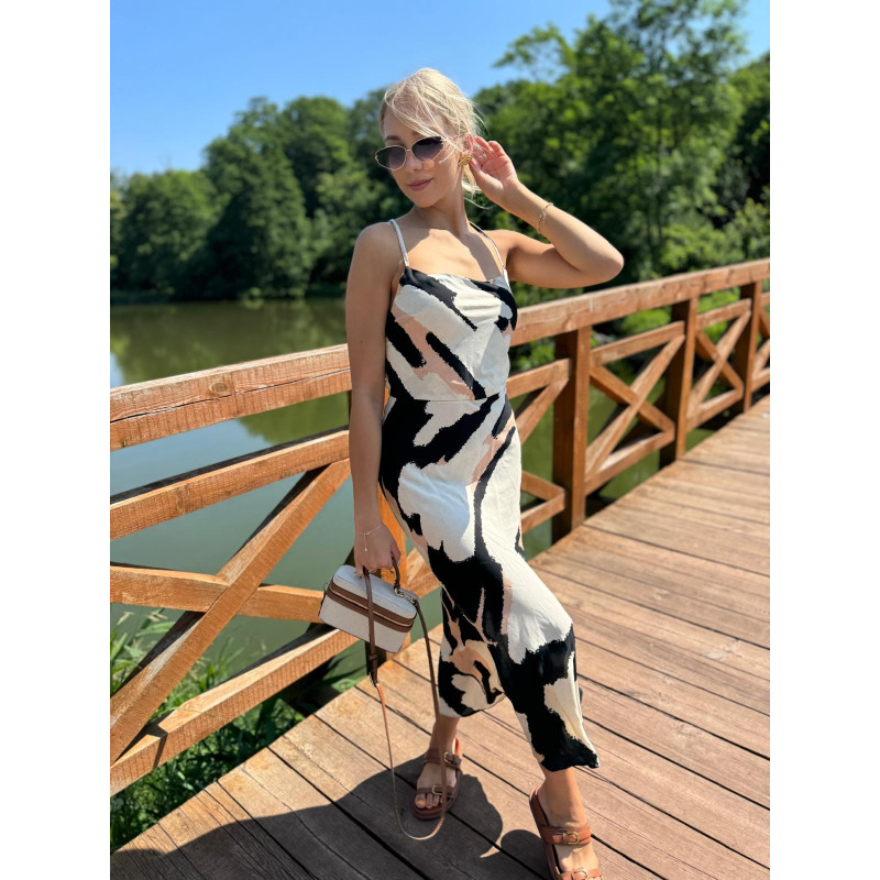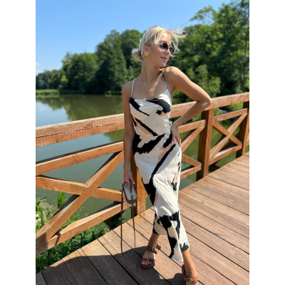 Sukienka NORAH w odcieniu jasnego beżu w brązowo-czarne ciapki. Sukienka na cienkich ramiączkach, odcinana pod biustem. Na plecach krzyżowana, z gumowaniem, które zapewnia komfort.