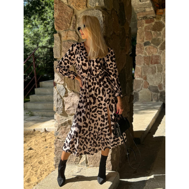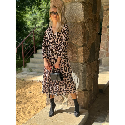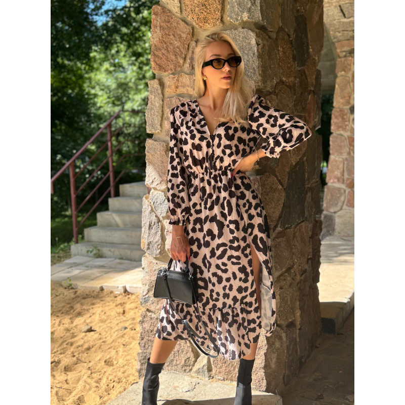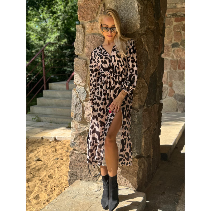 Sukienka Meg to idealna propozycja na jesień, dzięki klasycznym odcieniom brązu i beżu oraz długości midi, która nigdy nie wychodzi z mody. Model ten wyróżnia się kopertowym dekoltem ozdobionym guzikami oraz długimi rękawami zakończonymi mankietami z subtelną falbanką. Elastyczna gumka w pasie sprawia, że sukienka doskonale dopasowuje się do każdej sylwetki, a głębokie rozcięcie z boku dodaje elegancji i zmysłowości.
