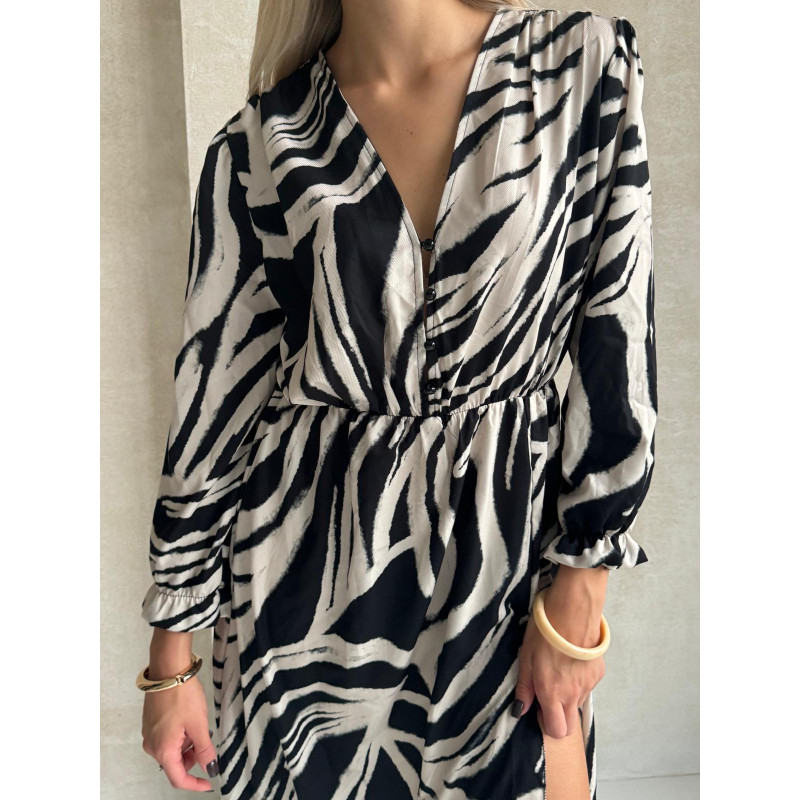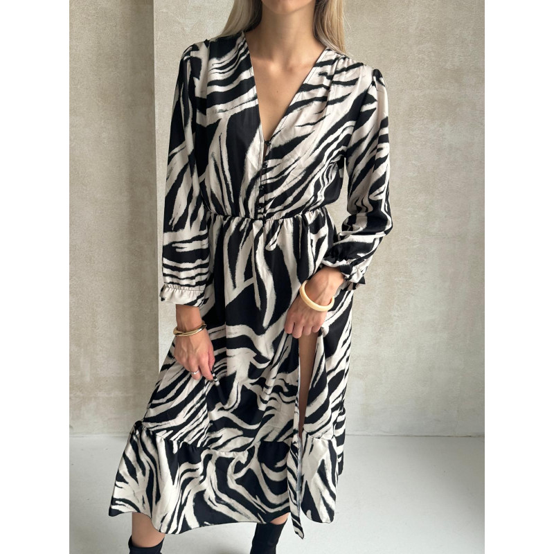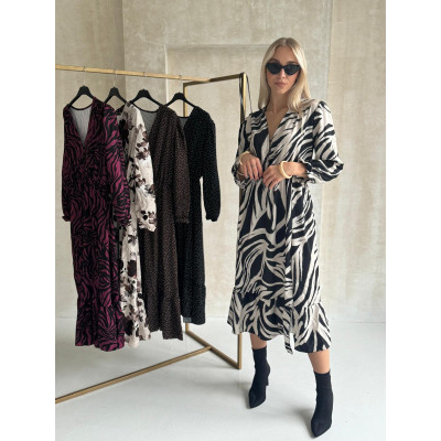 Lekki materiał pięknie układa się w ruchu, a długie rękawy sprawiają, że sukienka świetnie sprawdzi się w chłodniejsze dni.