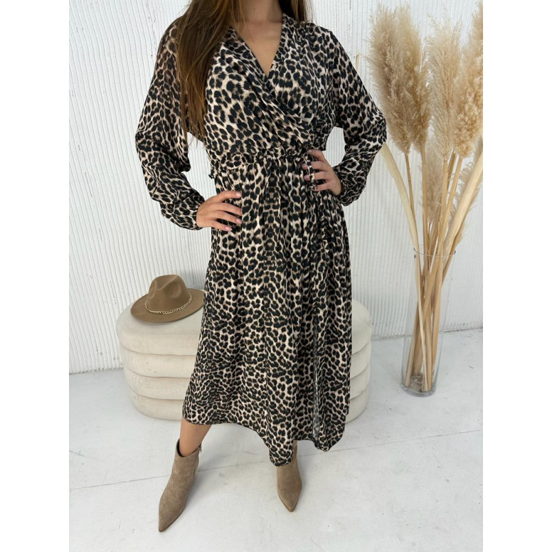 Sukienka maxi w zwierz臋cym princie. Dekolt na zak艂adk臋, d艂ugie r臋kawy mankietem na gumce. W pasie gumka z dodatkowym wi膮zaniem za pomoc膮 materia艂owego sznureczka w tym samym wzorze - pozwala on na idealne dopasowanie do naszej sylwetki. Sukienka z g艂臋bokim rozci臋ciem na nodze dodaje ca艂ej stylizacji szyku i zmys艂owo艣ci.