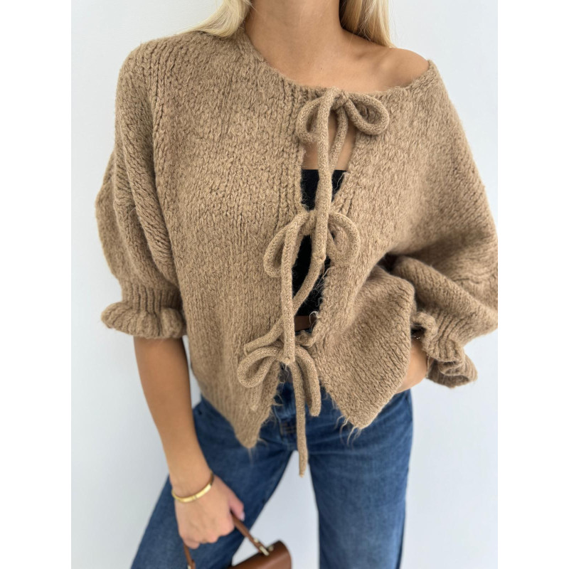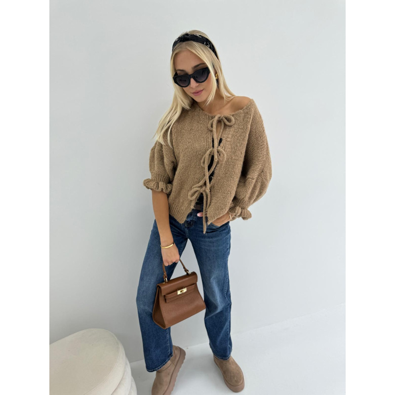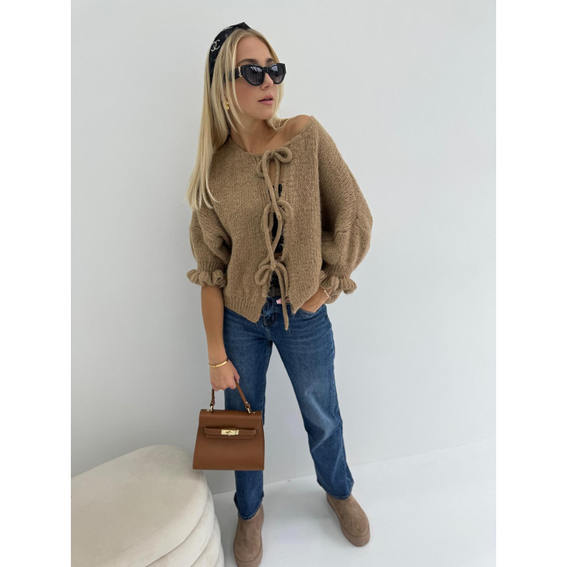 Uroczy kardigan SWEET - gego unikalny design z subtelnymi wiązaniami z przodu dodaje mu wyjątkowego uroku, a szersze rękawy nadają stylu i swobodnej elegancji.