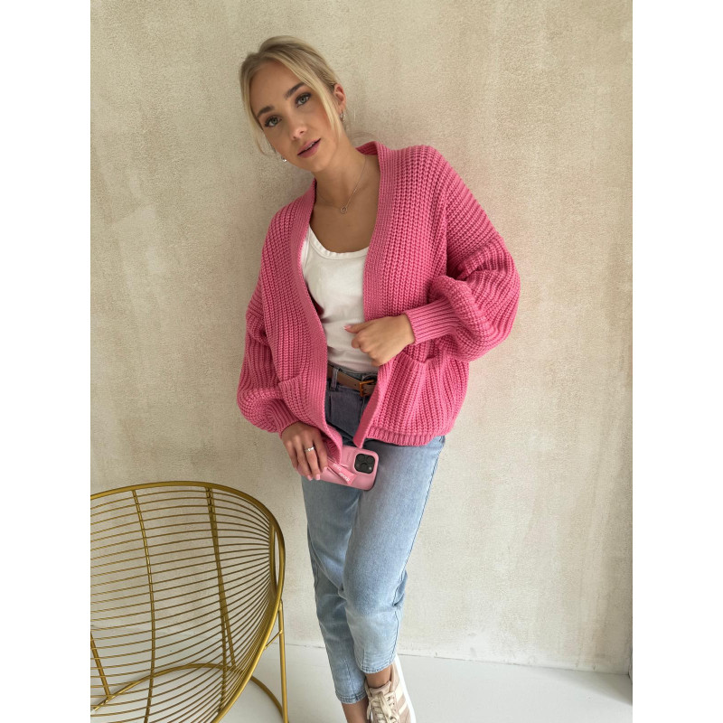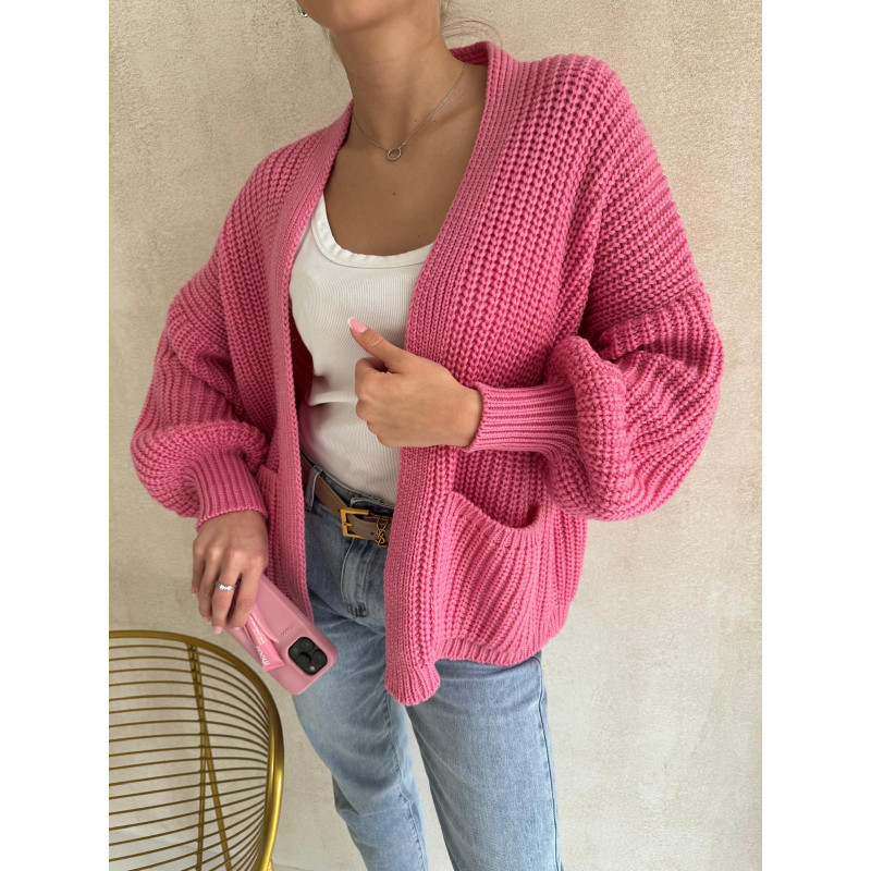 Kardigan Bocca o luźnym kroju w delikatnym, brudnym odcieniu różu. W całości niezapinany, z długimi, bufiastymi rękawami.
