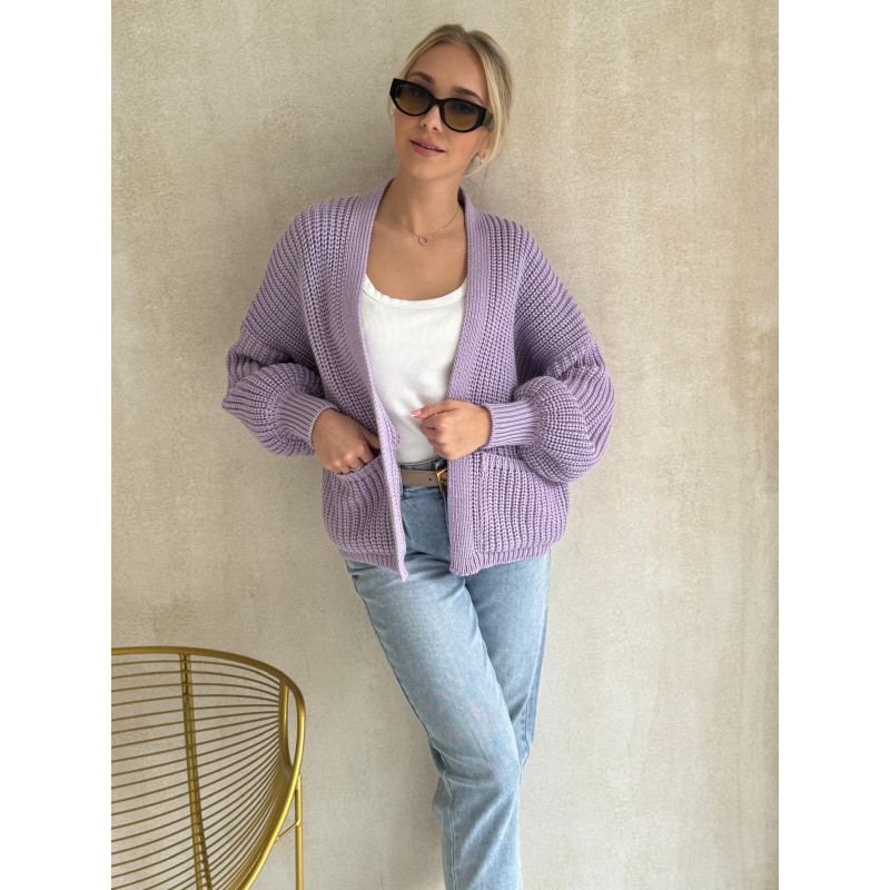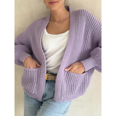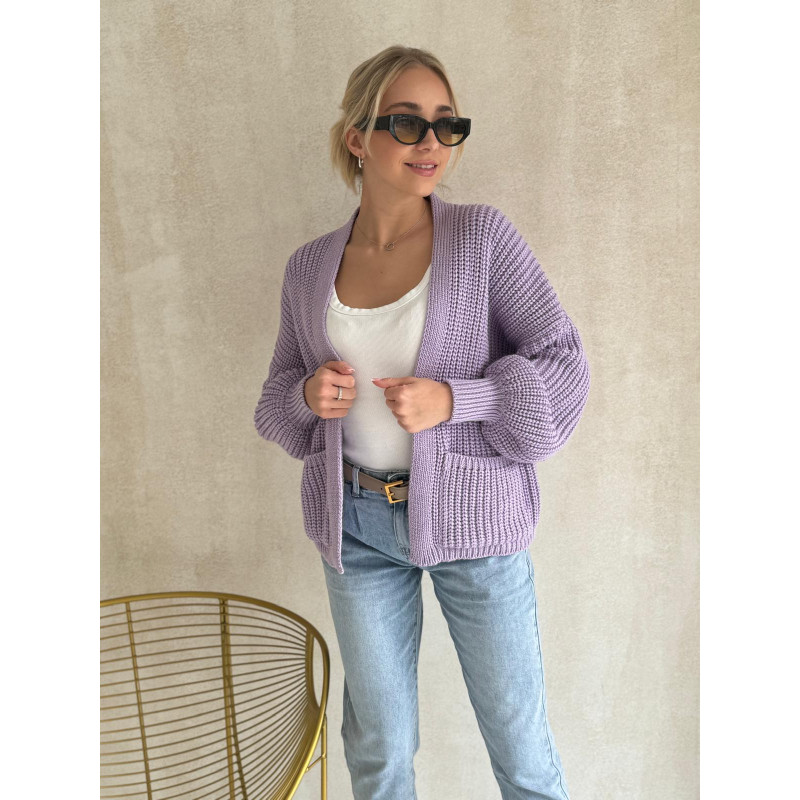 Kardigan Bocca o lu藕nym kroju w pastelowym odcieniu fioletu. W ca艂o艣膰 niezapinany, z d艂ugimi, bufiastymi r臋kawami.