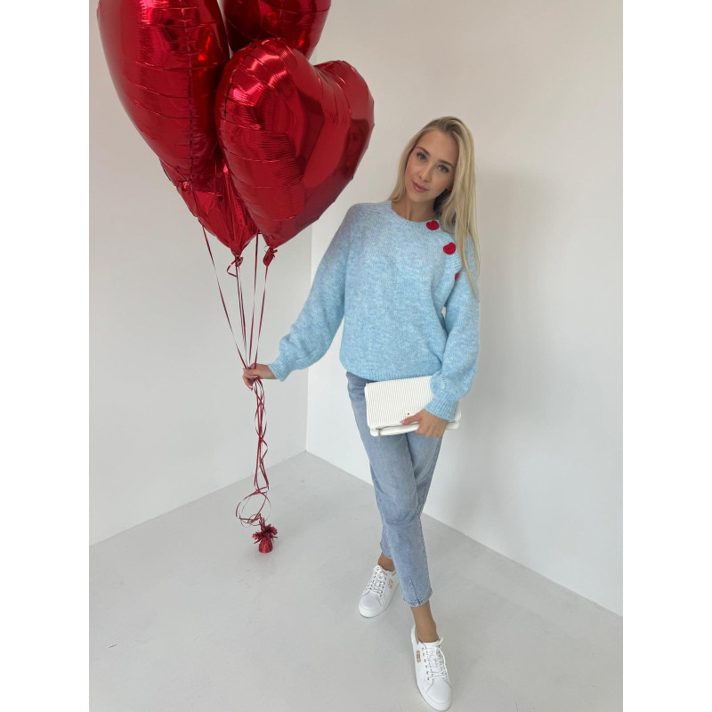 Najsłodszy detal? Trzy urocze serduszka umieszczone z lewej strony, które możesz odpiąć dzięki wszytym guziczkom, tworząc swój własny styl. Ściągacze na rękawach, dekolcie i dole swetra nadają mu klasycznej formy, a jednocześnie dbają o wygodę noszenia.