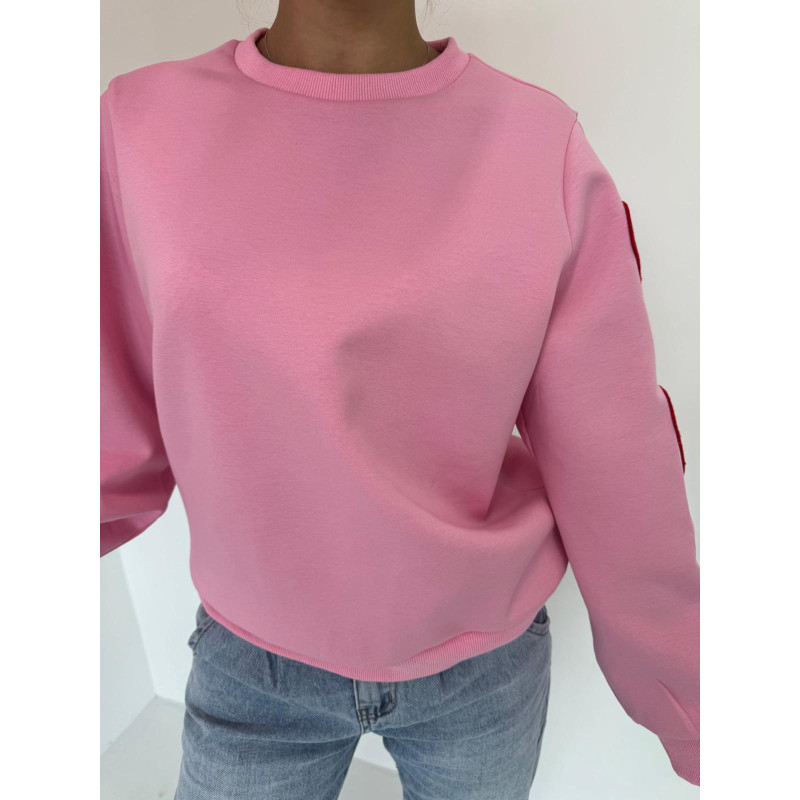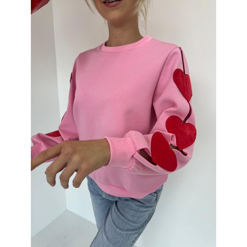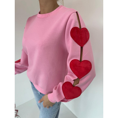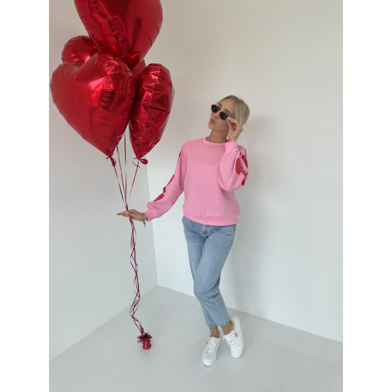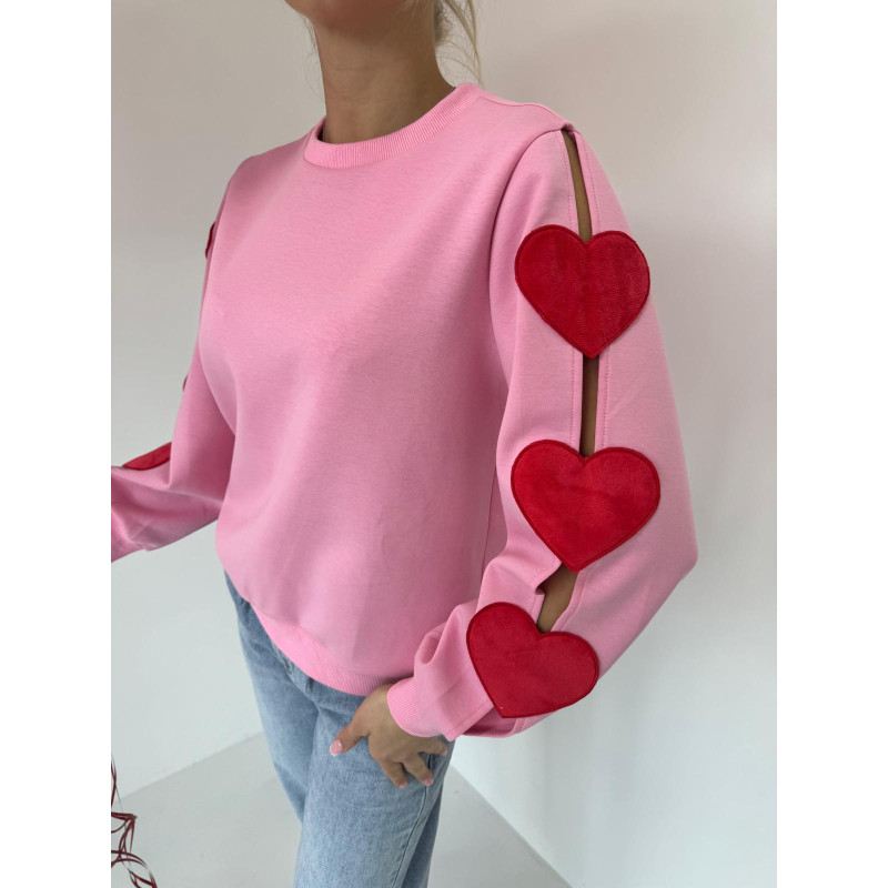 Wyjątkowa, walentynkowa bluza dla romantyczek i nie tylko! Klasyczny fason z okrągłym dekoltem i długimi rękawami, które kryją w sobie uroczy detal – trzy serca doszyte na stylowej przerwie w połowie rękawa. To subtelny, ale efektowny akcent, który wyróżnia ten model na tle innych.