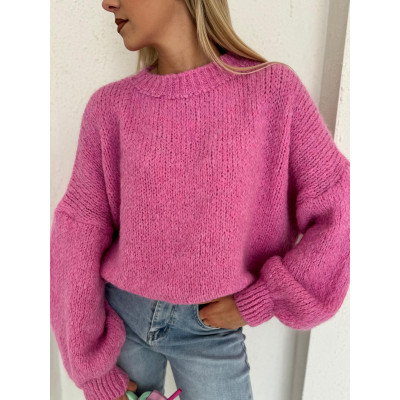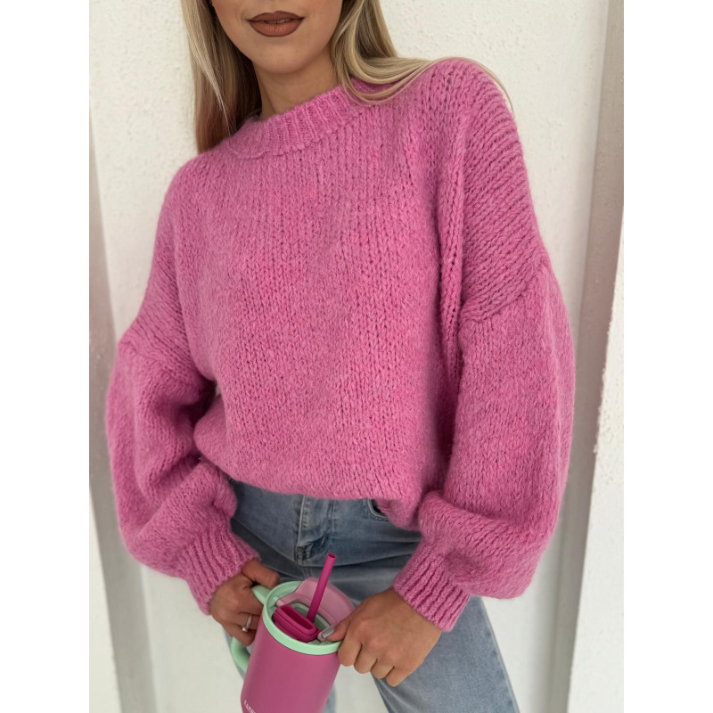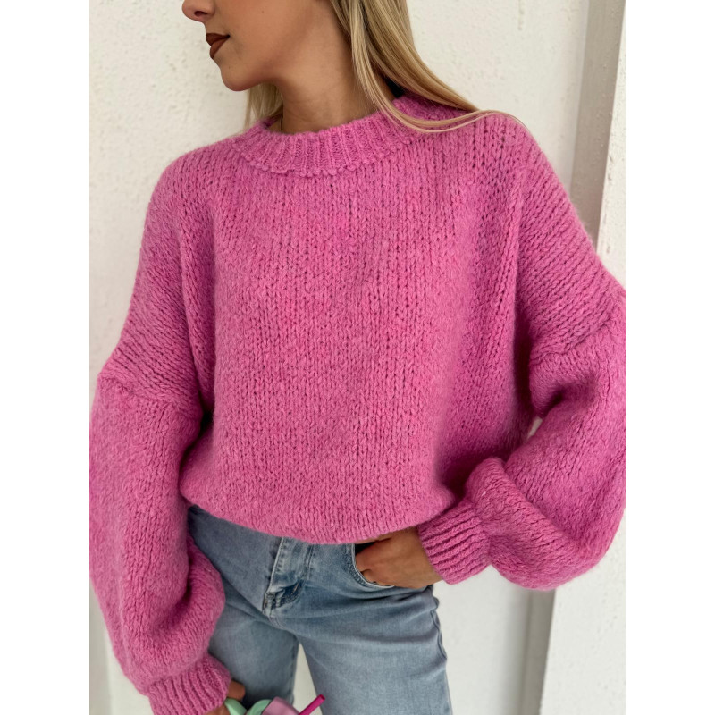 Zaokrąglony dekolt wykończony delikatnym prążkowanym ściągaczem podkreśla jego uniwersalny charakter, a obszerne, puszyste rękawy dodają mu niepowtarzalnego uroku. To sweter, który otula jak chmurka i sprawia, że każda stylizacja nabiera dziewczęcej lekkości.