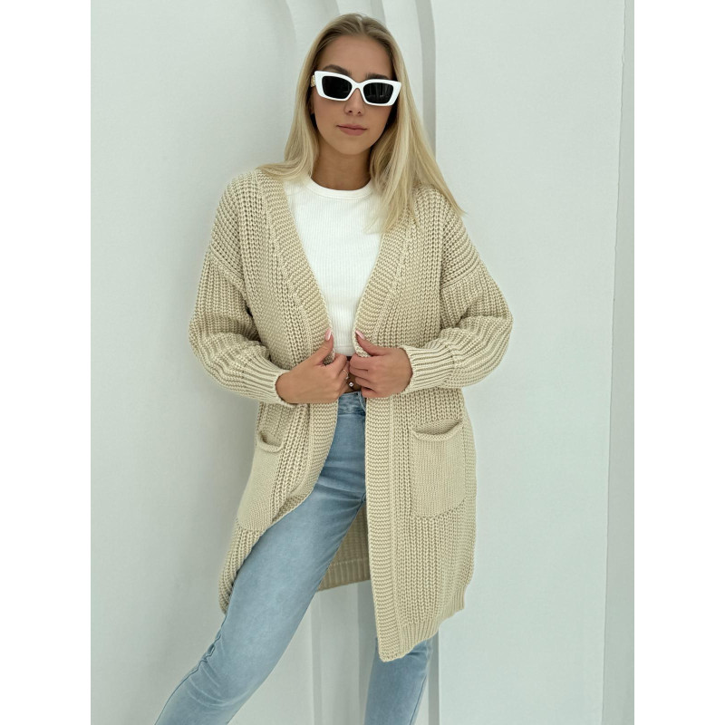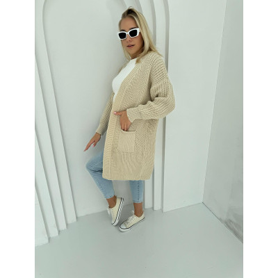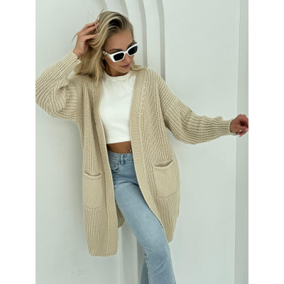 Kardigan Bocca o luźnym, przedłużanym kroju w odcieniu jasnego beżu. W całość niezapinany, z długimi, bufiastymi rękawami.