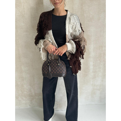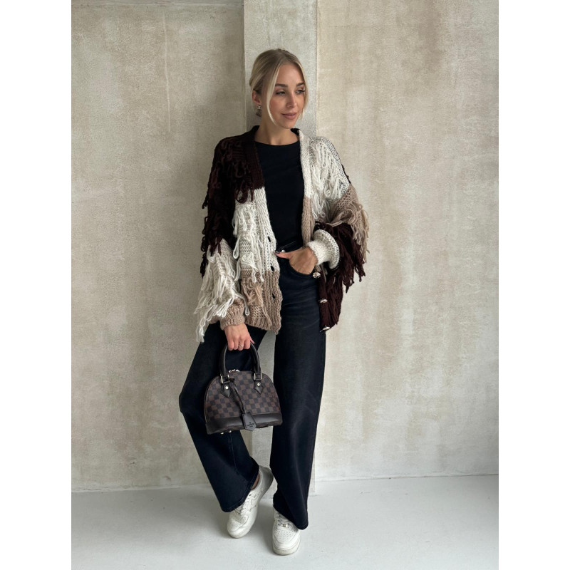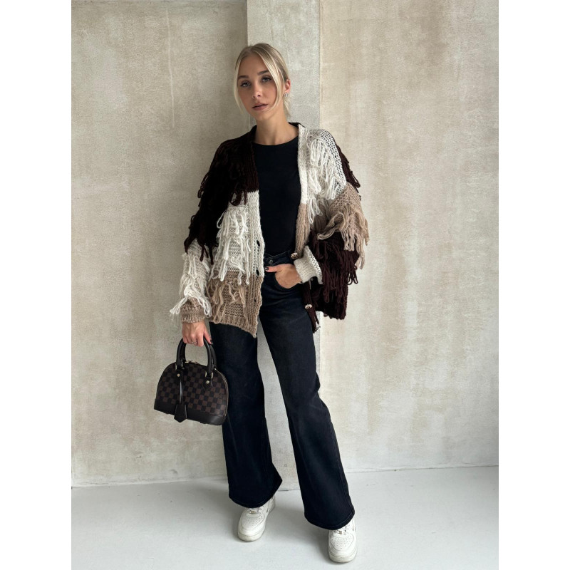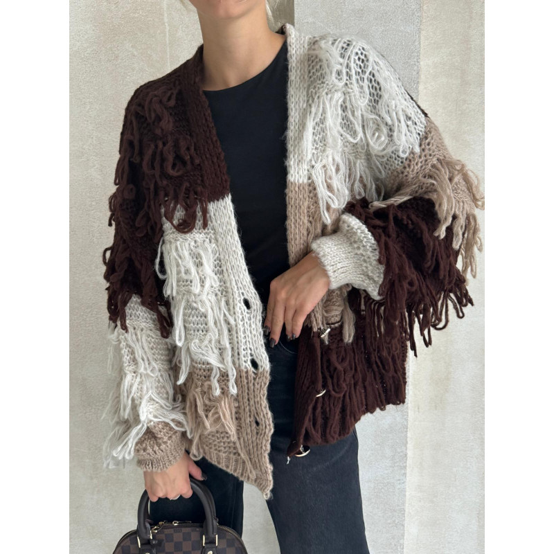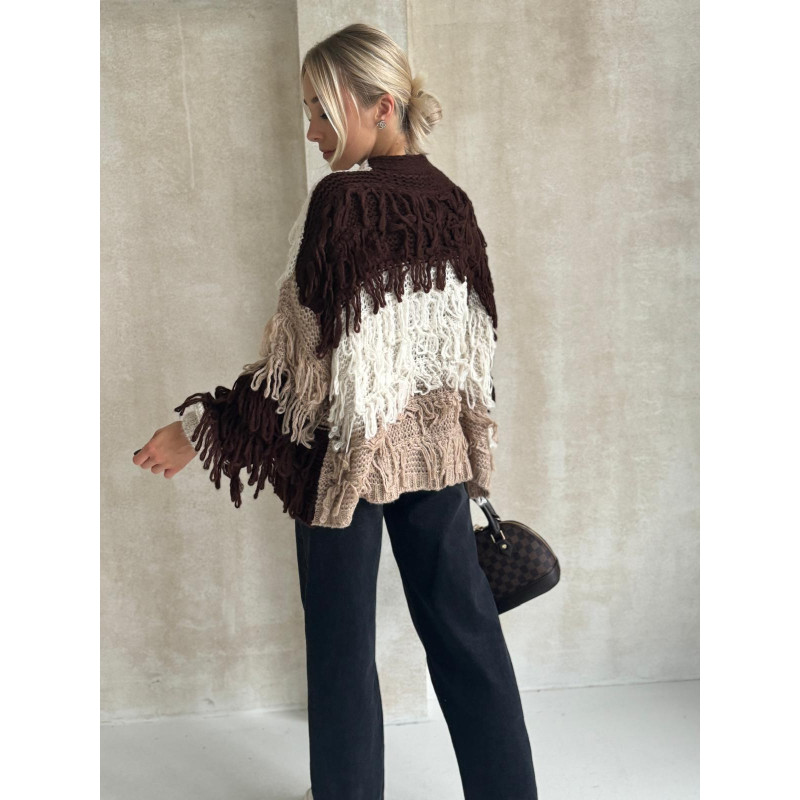 Kardigan o luźnym kroju, którego wyróżniają fantazyjne frędzle oraz kontrastujące przeszycia.