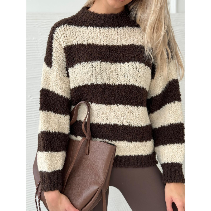 Miękki, puszysty i niezwykle przyjemny w dotyku sweter w szerokie, kontrastowe pasy w odcieniach ecru i czekoladowego brązu. Klasyczny, prosty krój z delikatnie obniżoną linią ramion nadaje mu nonszalanego charakteru, a grubszy splot typu boucle podkreśla jego przytulność.