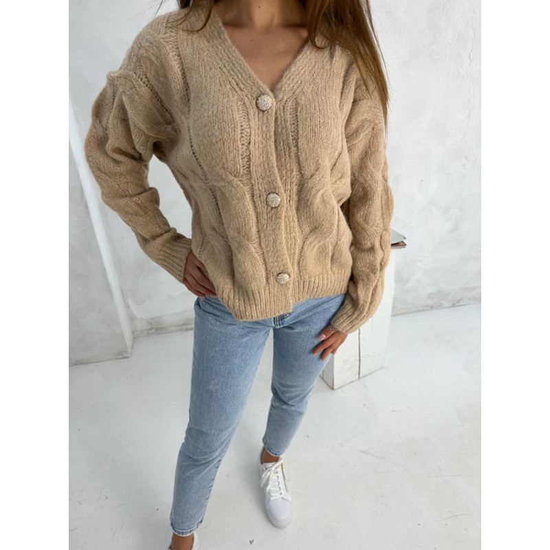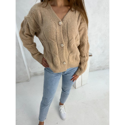 Kardigan Love z warkoczowym, mięsistym splotem. Obniżona linia ramion, dekolt w serek. Zapinany na złote, ozdobne guziki.