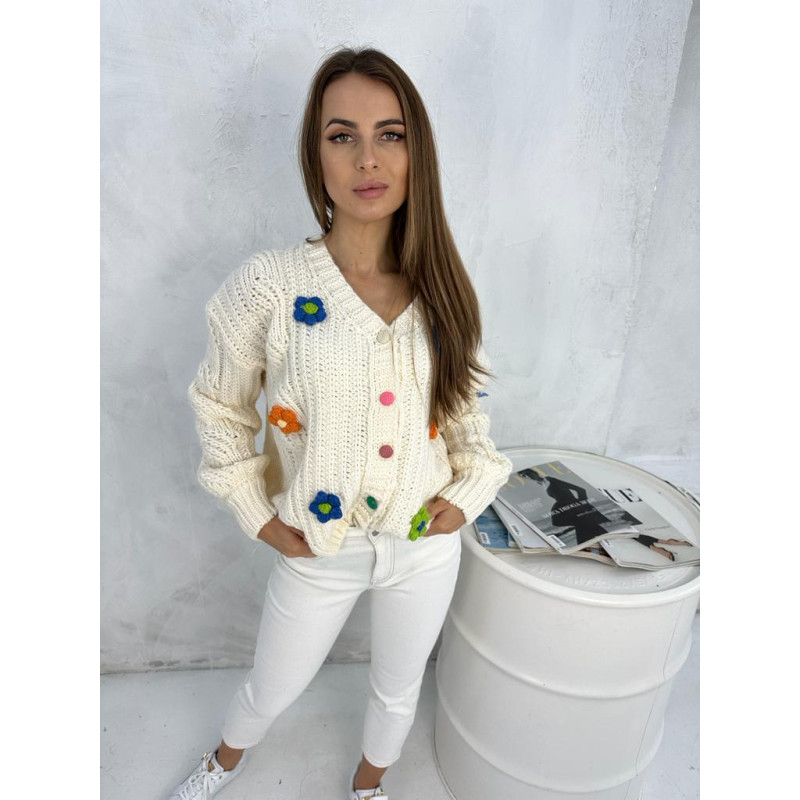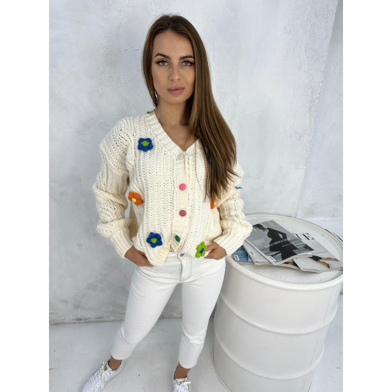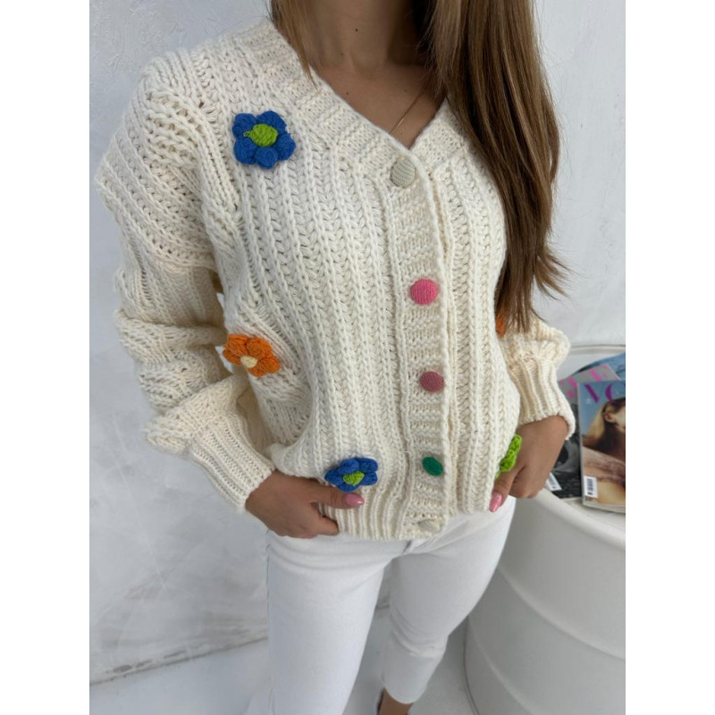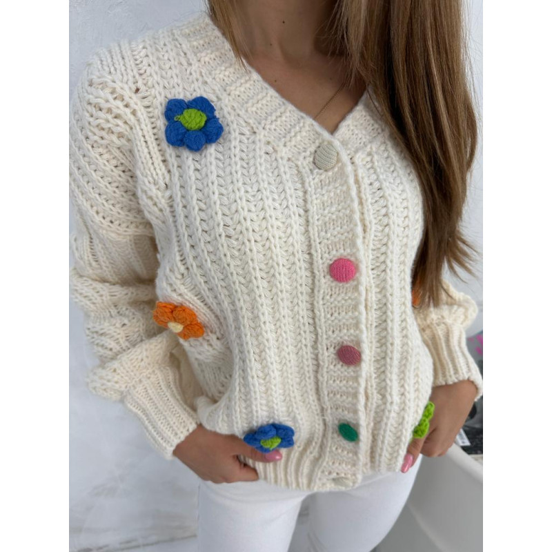 Krótki kardigan z naszywkami w postaci drobnych kwiatuszków. Zapinany na kolorowe, oblekane guziczki.
