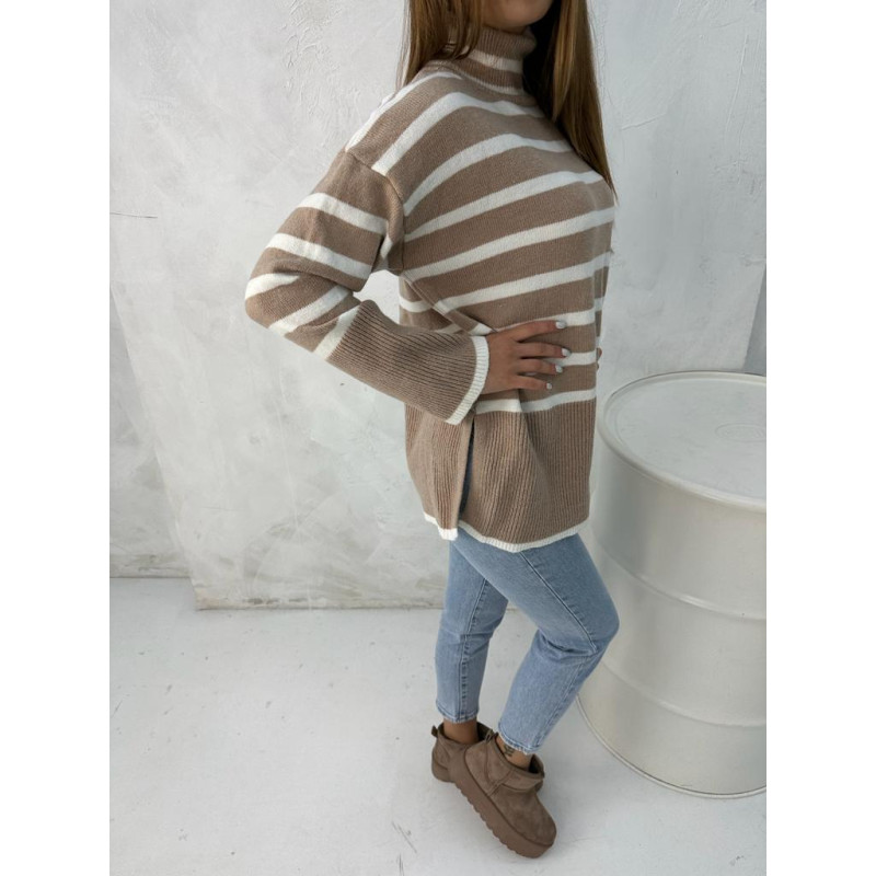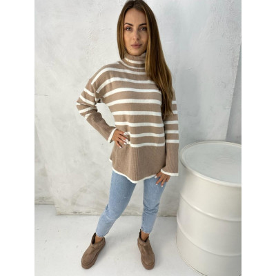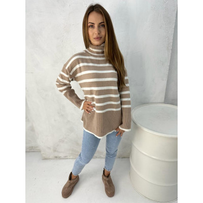 Golf Yess w klasycznych kolorach - bieli oraz karmelu. Luźne rękawy zakończone kontrastowym ściągaczem, z boku wysmuklające sylwetkę rozcięcie. Przedłuzany, delikatnie oversize'owy krój.
